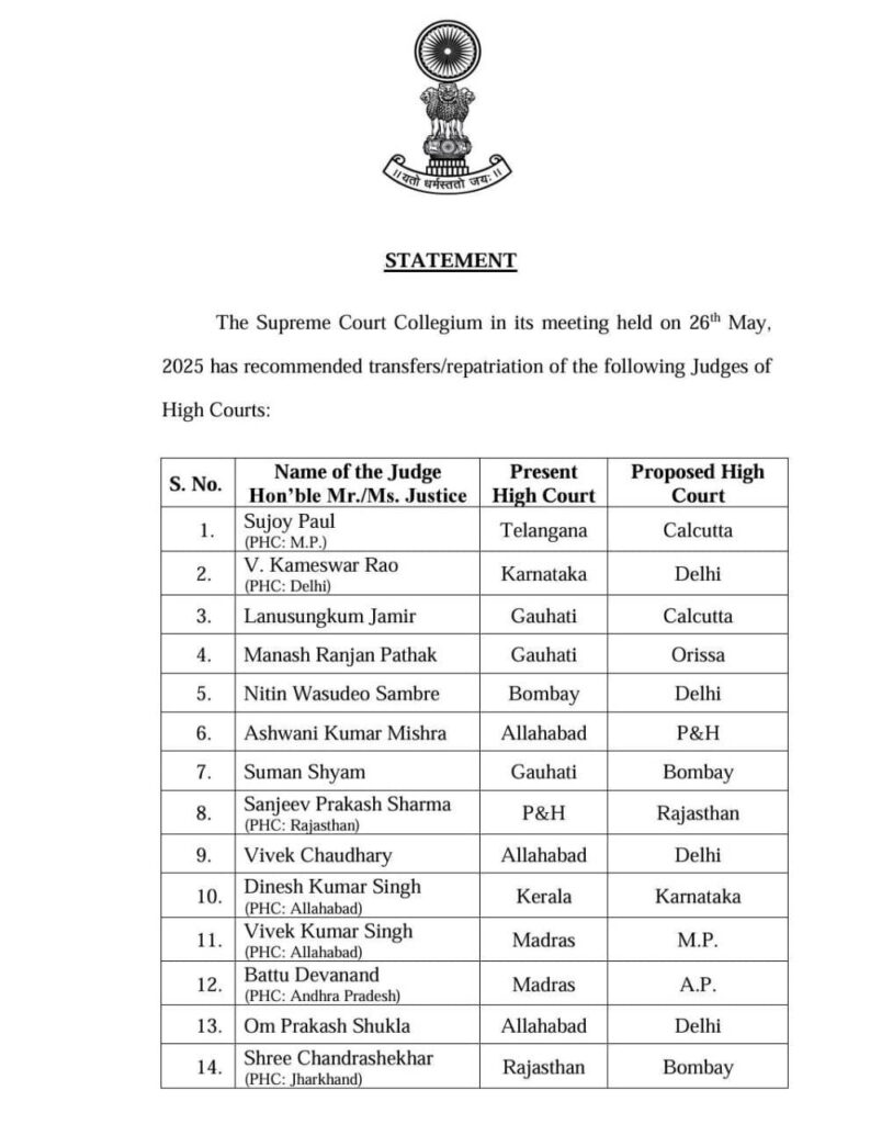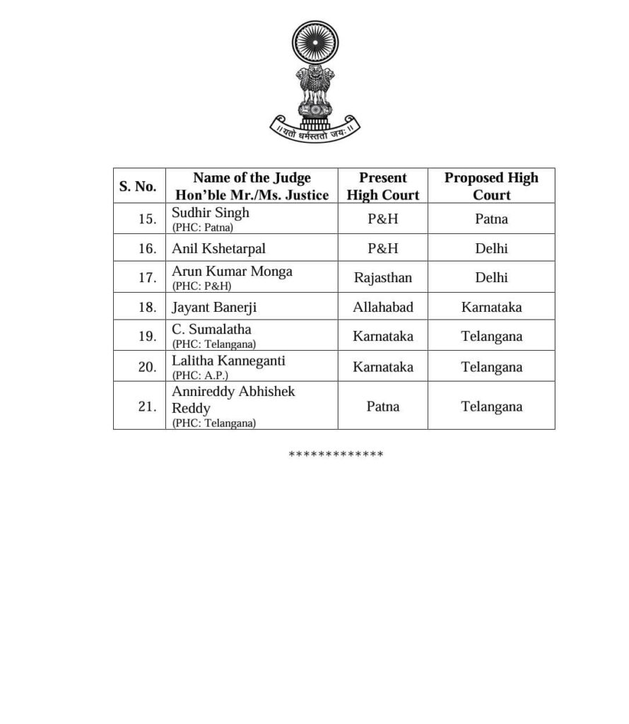 ఈ మేరకు సుప్రీంకోర్టు కొలిజియం (Supreme Court Collegium) నిర్ణయం తీసుకుంది. మొత్తం 21 మంది జడ్జీలను ట్రాన్స్ఫర్ చేసింది. తెలంగాణ హైకోర్టు(Telangana High Court) నుంచి జడ్జి సజయ్ పాల్ judge sajay pal బదిలీ అయ్యారు. తెలంగాణకు సి సుమలత, లలిత కన్నెగంటి, అన్ని రెడ్డి అభిషేక్ రెడ్డి బదిలీపై జడ్జిలుగా రానున్నారు. J