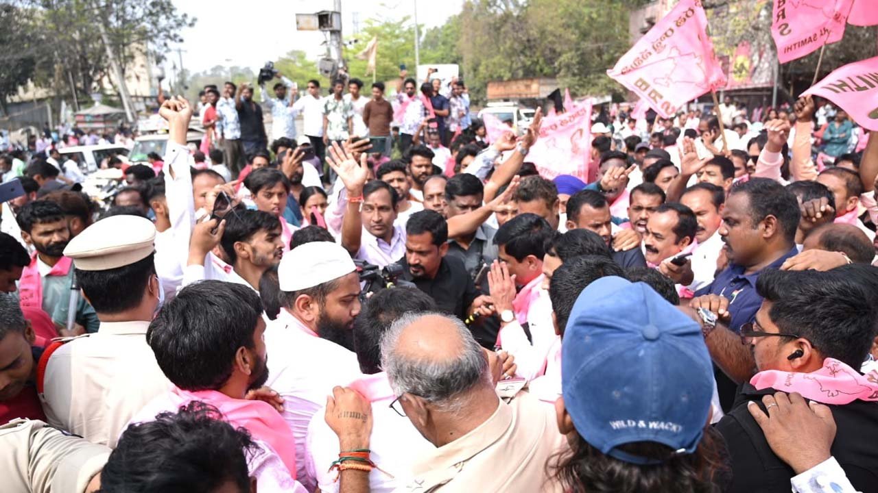 సిట్ విచారణకు వ్యతిరేకంగా సీఎం రేవంత్ రెడ్డి (CM Revanth Reddy) దిష్టిబొమ్మ దహనం చేయడానికి బీఆర్ఎస్ నాయకులు ప్రయత్నించారు. అయితే పోలీసులు ఈ చర్యలను అడ్డగించారు. దీంతో బీఆర్ఎస్ నేతలు పోలీసుల మధ్య కాస్త తోపులాట చోటుచేసుకుంది. కొందరు కార్యకర్తలను అరెస్టు చేసి పోలీస్ స్టేషన్కు తరలించారు. అలాగే ఎమ్మెల్యే ప్రశాంత్ రెడ్డి, మాజీ ఎమ్మెల్యే గణేష్ గుప్తా (Former MLA Ganesh Gupta), నగర అధ్యక్షుడు రాజు, నుడా మాజీ ఛైర్మన్ ప్రభాకర్ను అడ్డుకొని పార్టీ కార్యాలయానికి తరలించారు.