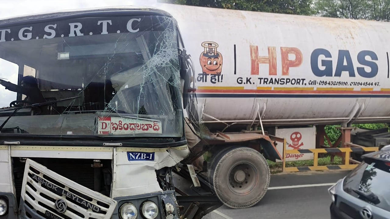 స్థానికుల కథనం ప్రకారం.. నిజామాబాద్ డిపో–1కు (Nizamabad Depot-1) చెందిన ఆర్టీసీ బస్సు సికింద్రాబాద్ నుంచి నిజామాబాద్ వైపు వెళ్తోంది. అదే దారిలో మహారాష్ట్రకు (Maharashtra) చెందిన హెచ్పీ గ్యాస్ ట్యాంకర్ నిజామాబాద్ వైపే వెళ్తోంది. అయితే పొందుర్తి శివారులో ట్యాంకర్ను ఆర్టీసీ బస్సు వెనుక నుంచి బలంగా ఢీకొట్టింది.