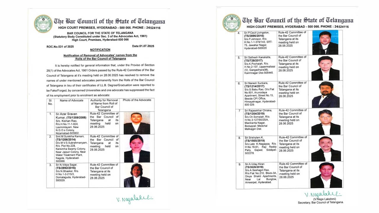 ఫేక్ లా సర్టిఫికెట్లతో న్యాయవాదులుగా ఎన్రోల్ అయిన తొమ్మిది మందిని బార్ కౌన్సిల్ తొలగించింది. ఈ మేరకు మంగళవారం (జూన్ 2) బార్ కౌన్సిల్ సెక్రటరీ ప్రకటన జారీ చేశారు.
