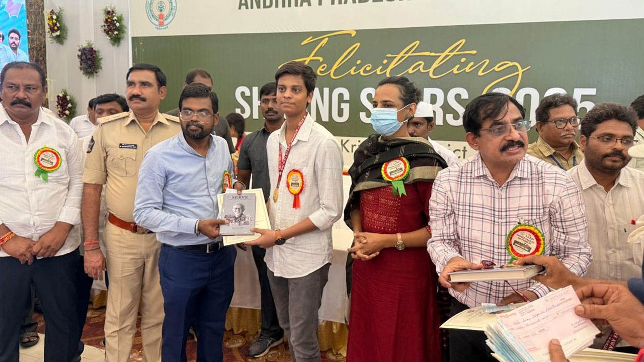 అక్షరటుడే, వెబ్డెస్క్: SSC Results | ఆంధ్రప్రదేశ్(Andhra Pradesh) పదో తరగతి ఫలితాల్లో ప్రతిభ చూపిన విద్యార్థులను అక్కడి ప్రభుత్వం షైనింగ్ స్టార్స్(Shining Stars) ప్రోగ్రాం ద్వారా ప్రోత్సహిస్తోంది. ఇందులో భాగంగా సోమవారం అత్యధిక మార్కులు సాధించిన విద్యార్థులకు గోల్డ్ మెడల్, సర్టిఫికెట్, రూ.20 వేల స్టైఫండ్ అందజేసింది. నిజామాబాద్ జిల్లా(Nizamabad District) చెందిన చాట్ల రవిప్రసాద్ కుమారుడు ఆదిత్య సాయి ఏపీ పదో తరగతి ఫలితాల్లో 594 మార్కులు సాధించాడు. దీంతో కృష్ణా జిల్లా కలెక్టర్ డీకే బాలాజీ, అదనపు కలెక్టర్ గీతాంజలి శర్మ విద్యార్థికి గోల్డ్ మెడల్(Gold medal), స్టైఫండ్ చెక్కు(stipend check) అందజేశారు.