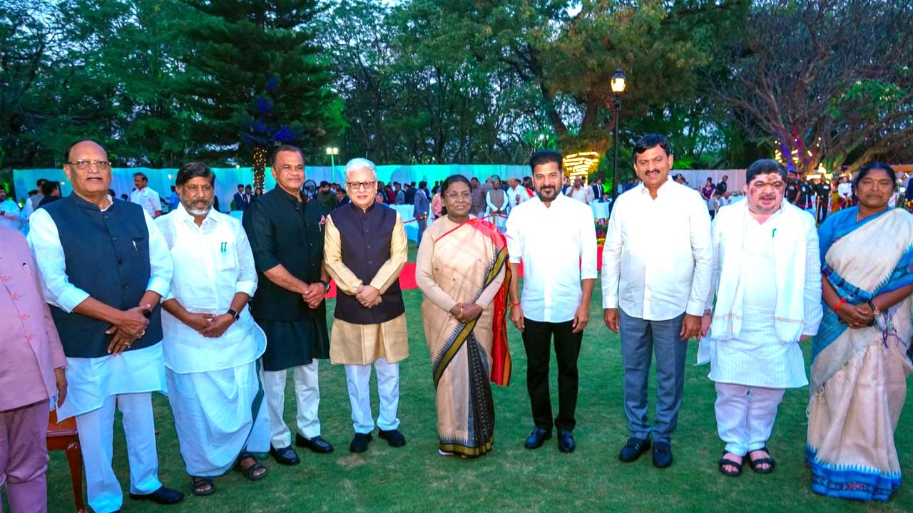 శాసనమండలి చైర్మన్ గుత్తా సుఖేందర్ రెడ్డి, శాసనసభ స్పీకర్ గడ్డం ప్రసాద్ కుమార్, ఉప ముఖ్యమంత్రి మల్లు భట్టి విక్రమార్క, హైకోర్టు ప్రధాన న్యాయమూర్తి జస్టిస్ అపరేష్ కుమార్ సింగ్, మంత్రులు, న్యాయమూర్తులు, పలువురు పార్లమెంట్ సభ్యులు, ప్రభుత్వ ప్రధాన కార్యదర్శి, నగర ప్రముఖులు, త్రివిధ దళాలకు చెందిన అధికారులు, ప్రభుత్వ ఉన్నతాధికారులు పాల్గొన్నారు. రాష్ట్రపతి ముర్ము అతిథులతో ఆత్మీయంగా మాట్లాడారు.