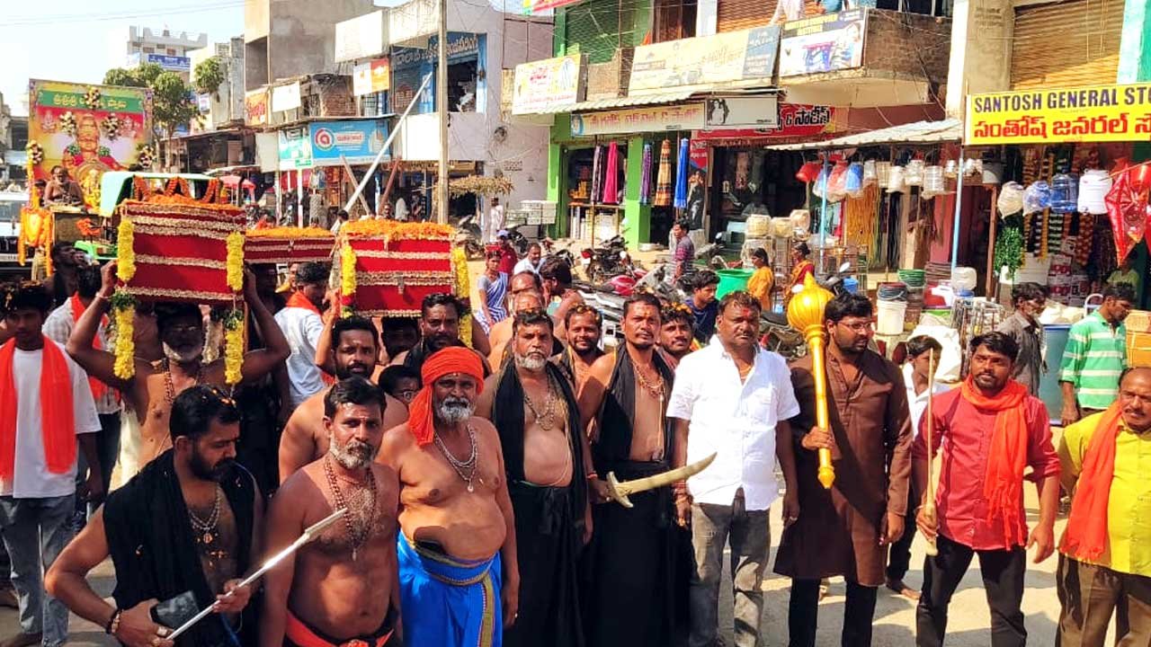 అయ్యప్ప స్వామి ఉత్సవ విగ్రహాన్ని పూలతో అందంగా అలంకరించిన ట్రాక్టర్పై ఏర్పాటుచేసి శోభాయాత్రను ప్రారంభించారు. శివాజీ చౌక్, వైశ్య భవన్, డైలీ మార్కెట్, గాంధీచౌక్, బస్టాండ్ మీదుగా అయ్యప్ప స్వాములు (Ayyappa devotees) పాటలు పాడుతూ.. పేటతుళ్లి ఆడుతూ శోభాయాత్రను నిర్వహించారు. శోభాయాత్రలో వెళ్తున్న అయ్యప్పస్వాములకు మహిళలు మంగళహారతులు ఇస్తూ పాదపూజలు నిర్వహించారు. భక్తులకు పండ్లు పంపిణీ చేశారు. పెద్ద చెరువులో ఆలయ పూజారి శ్రీనివాసరావు ఆధ్వర్యంలో అయ్యప్ప ఉత్సవ విగ్రహానికి తీర్థస్నానం చేయించారు. కార్యక్రమంలో గురు స్వాములు చంద్రం, కృష్ణారెడ్డి, రాజేంద్రనాథ్, దేవగౌడ్, ఈశ్వర్ గౌడ్, మురళి, డాక్టర్ సాయిలు, అమృత్, శశికాంత్ రెడ్డి, తరుణ్, హరిబాబు, హరిప్రసాద్ అయ్యప్ప భక్తులు పెద్దఎత్తున పాల్గొన్నారు.