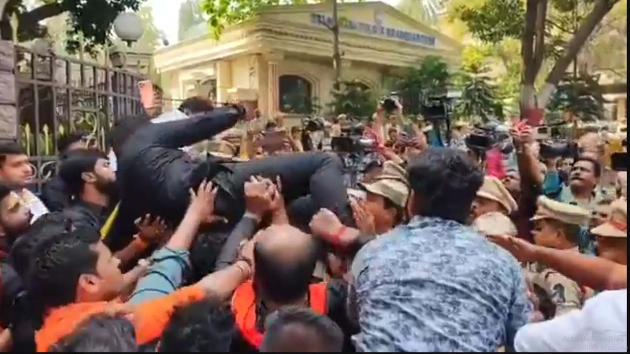 అయ్యప్ప మాల విషయంలో పోలీసు ఉన్నతాధికారుల తీరును నిరసిస్తూ గురువారం ఉదయం స్వాములు, బీజేవైఎం కార్యకర్తలు (BJYM Leaders) పెద్ద ఎత్తున డీజీపీ కార్యాలయ ముట్టడికి బయలు దేరారు. కార్యాలయం (DGP Office) లోపలికి వెళ్లేందుకు స్వాములు యత్నించారు. ఈ క్రమంలో స్వాములకు, పోలీసులకు మధ్య తోపులాట చోటుచేసుకుంది. దీంతో అక్కడ ఉద్రిక్తత నెలకొంది. కొందరు స్వాములను అరెస్ట్ చేసి అక్కడి నుంచి తరలించారు. ఈ సందర్భంగా అయ్యప్ప మాలధారులు మాట్లాడుతూ.. మాల వేసుకున్న పోలీసుల యూనిఫాంపై ఆంక్షలు ఎందుకంటూ నిరసన తెలిపారు. హిందువుల మనోభావాలను దెబ్బతీసేలా రూల్స్ ఉన్నాయని ఆగ్రహం వ్యక్తం చేశారు.