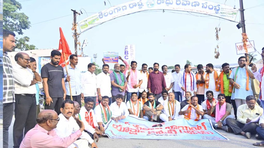 నిజామాబాద్ నగరంలోని ఆర్టీసీ డిపో ఎదుట బీసీ జేఏసీ ఆధ్వర్యంలో ధర్నా చేస్తున్న నాయకులు