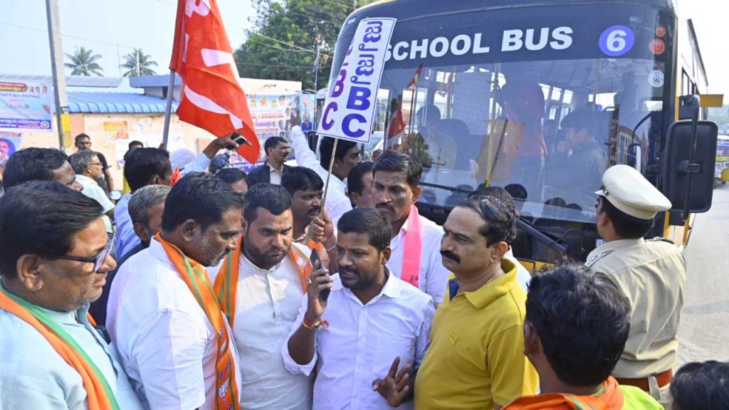 నగరంలో ఓ స్కూల్ బస్సును నిలిపివేసి బీసీ బంద్ విషయాన్ని వివరిస్తున్న ఆల్పార్టీ ప్రతినిధులు