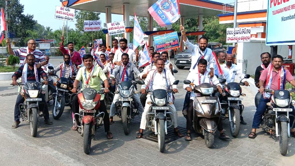 బీసీ సంక్షేమ సంఘం(Bc Sankshema Sangham) ఆధ్వర్యంలో శనివారం తెల్లవారుజామున నగరంలోని బస్డిపో ఎదుట బస్సులు బయటకు రాకుండా ధర్నా నిర్వహించారు. బీసీ సంక్షేమ సంఘం జిల్లా అధ్యక్షుడు నరాల సుధాకర్ ఆధ్వర్యంలో ప్రతినిధులు నగరంలో బైక్ ర్యాలీ నిర్వహించారు. పలు వ్యాపార సంస్థల యజమానులకు బీసీ రిజరేషన్ల అత్యవసరాన్ని వివరించారు.