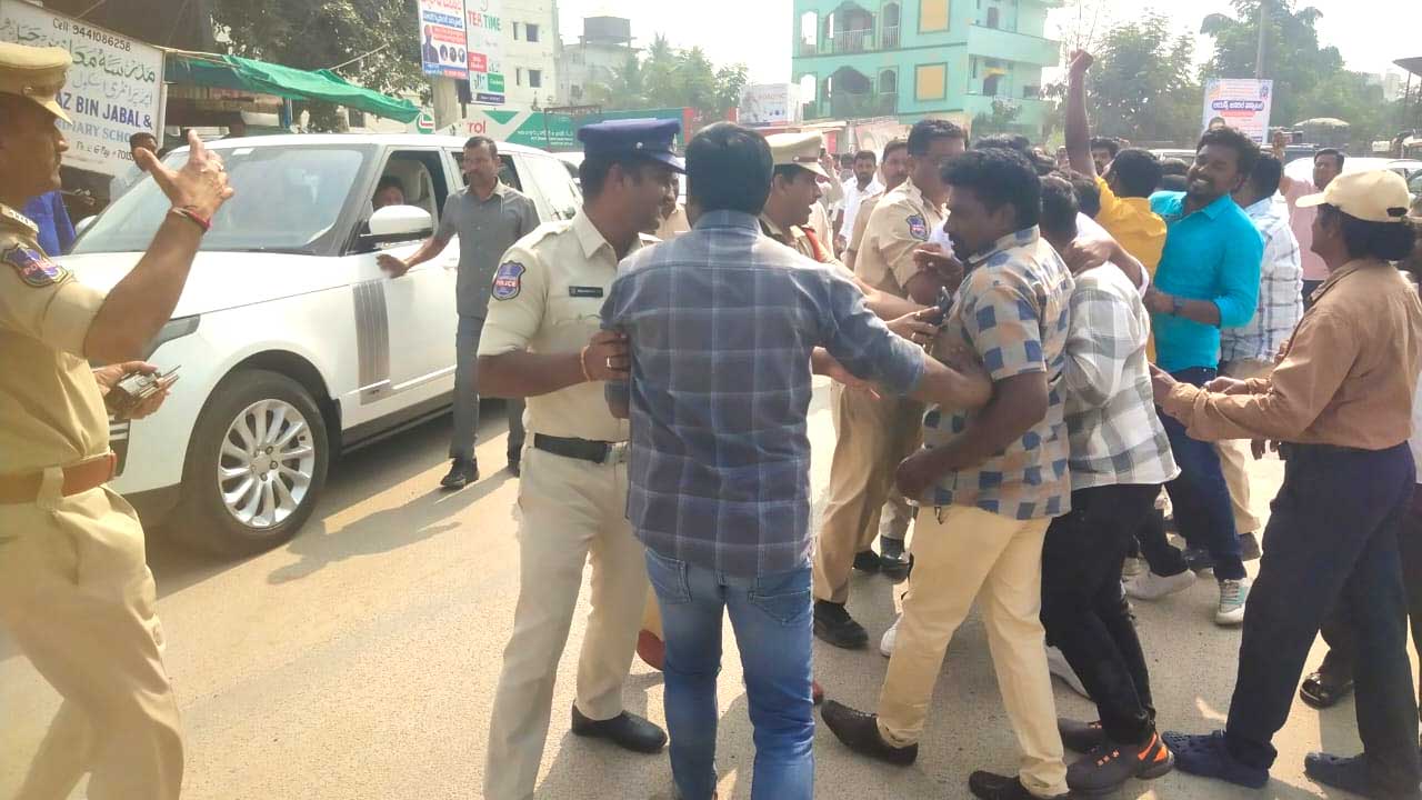 పలు అభివృద్ధి కార్యక్రమాలను ప్రారంభించేందుకు వెళ్తున్న ఎమ్మెల్యే సుదర్శన్ రెడ్డిని (MLA Sudarshan Reddy) పట్టణంలో బీఆర్ఎస్ నాయకులు (Bodhan BRS) అడ్డుకునే ప్రయత్నం చేశారు. దీంతో అప్రమత్తమైన పోలీసులు ఎమ్మెల్యే కాన్వాయ్కు అడ్డుగా వెళ్తున్న వారిని తప్పించి పోలీస్స్టేషన్కు (Bodhan Police station) తరలించారు. అనంతరం ట్రాఫిక్ క్లియర్ చేశారు.