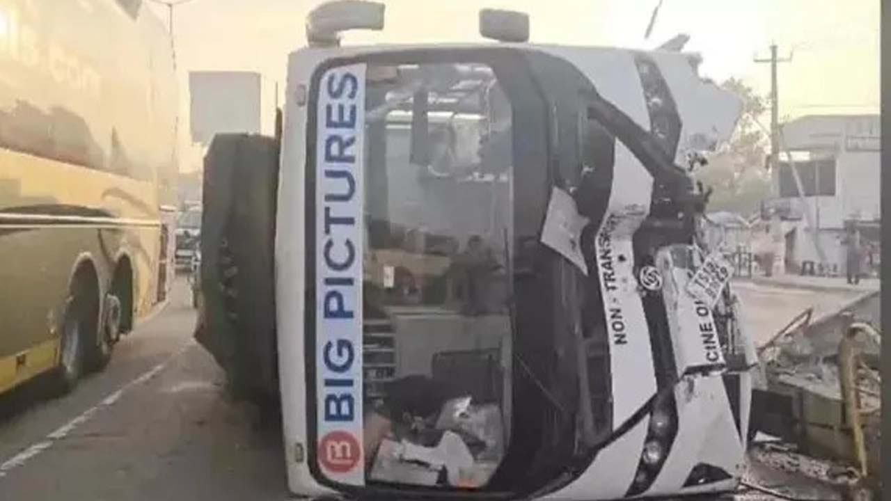 విశాఖపట్నం నుంచి హైదరాబాద్ మణికొండ (Manikonda) ప్రాంతానికి సినిమా షూటింగ్ కోసం బయల్దేరిన బస్సు పెద్ద అంబర్పేట ఫ్లైఓవర్ వద్దకు చేరుకునే సమయంలో ఈ ప్రమాదం జరిగింది. తెల్లవారుజామున కావడంతో రోడ్డు ఖాళీగా ఉండడం వల్ల భారీ ప్రాణనష్టం తప్పినట్లు స్థానికులు తెలిపారు. అయితే బస్సు అదుపు తప్పి డివైడర్ను ఢీకొట్టడంతో ఒక్కసారిగా బోల్తా పడింది. ప్రమాద సమాచారం అందుకున్న వెంటనే పోలీసులు, అంబులెన్స్ సిబ్బంది సంఘటనా స్థలానికి చేరుకుని సహాయక చర్యలు చేపట్టారు. గాయపడిన డ్రైవర్ను సమీప ఆసుపత్రికి తరలించి చికిత్స అందిస్తున్నారు. ఆయన ఆరోగ్య పరిస్థితి నిలకడగా ఉన్నట్లు వైద్యులు తెలిపారు.