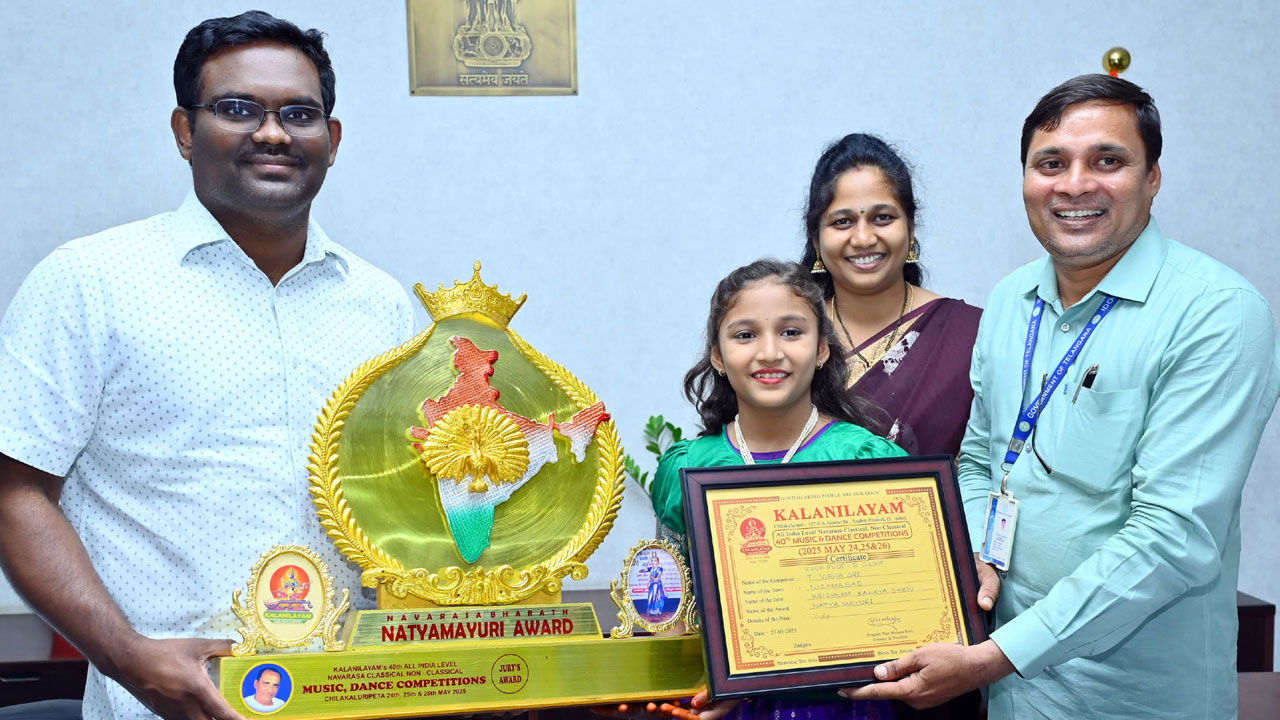 అక్షరటుడే, ఇందూరు: Collector | నిజామాబాద్ (Nizamabad)కు చెందిన కూచిపూడి నృత్య కళాకారిణి విభశ్రీని కలెక్టర్ రాజీవ్గాంధీ హన్మంతు (Collector Rajiv Gandhi Hanumanth) అభినందించారు. విభశ్రీ ఇటీవల ఆంధ్రప్రదేశ్లోని చిలకలూరిపేట కళానిలయంలో జరిగిన 40వ జాతీయస్థాయి నవరస శాస్త్రీయ సంగీత నాట్య పోటీల్లో పాల్గొని ప్రత్యేక జ్యూరీ నాట్య మయూరి అవార్డు అందుకుంది. ఈ సందర్భంగా కలెక్టర్ బుధవారం ఆమెను ప్రత్యేకంగా అభినందించారు. భవిష్యత్తులో మరిన్ని విజయాలు సాధించాలని ఆకాంక్షించారు. కార్యక్రమంలో విభశ్రీ తల్లిదండ్రులు విజయ్కుమార్, ప్రసన్న పాల్గొన్నారు.
