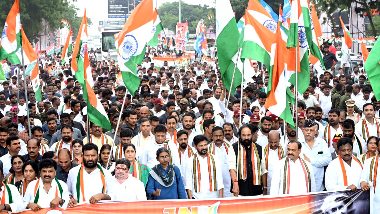 అక్షరటుడే, వెబ్ డెస్క్: Jai Hind Yatra | ఏఐసీసీ పిలుపు మేరకు బాచుపల్లిలో రాష్ట్ర కాంగ్రెస్ పార్టీ ఆధ్వర్యంలో గురువారం జైహింద్ యాత్ర చేపట్టారు. మేడ్చల్ నియోజకవర్గంలోని పీఎన్ఆర్ ఇంజినీరింగ్ కళాశాల (PNR Engineering College) నుంచి కేజీఆర్ కన్వెన్షన్ వరకు భారీ ర్యాలీ చేపట్టారు.