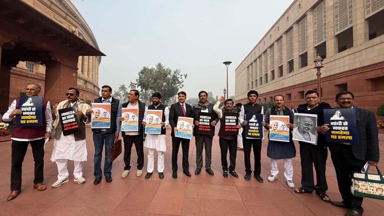 కేంద్ర ప్రభుత్వం (Central Government) ఇటీవల మహాత్మా గాంధీ జాతీయ ఉపాధి హామీ పథకం పేరు మార్చిన విషయం తెలిసిందే. ఈ మేరకు పార్లమెంట్లో బిల్లు ప్రవేశ పెట్టింది. పాత చట్టాన్ని రద్దు చేసి, దాని స్థానంలో వికసిత్ భారత్ రోజ్గార్, ఆజీవికా హామీ మిషన్ (VB-G RAM G) ప్రవేశ పెట్టింది. కేంద్ర ప్రభుత్వ తీరుకు నిరసనగా గురువారం ఉదయం పార్లమెంట్ ఆవరణలో కాంగ్రెస్తో పాటు విపక్ష ఎంపీలు నిరసన తెలిపారు. మహాత్మా గాంధీ (Mahatma Gandhi) చిత్రపటాలను చేతిలో పట్టుకుని నినాదాలు చేశారు. రామ్ జీ బిల్లుకు వ్యతిరేకంగా నిరసన ప్రదర్శన నిర్వహించి, దానిని ఉపసంహరించుకోవాలని డిమాండ్ చేశారు.