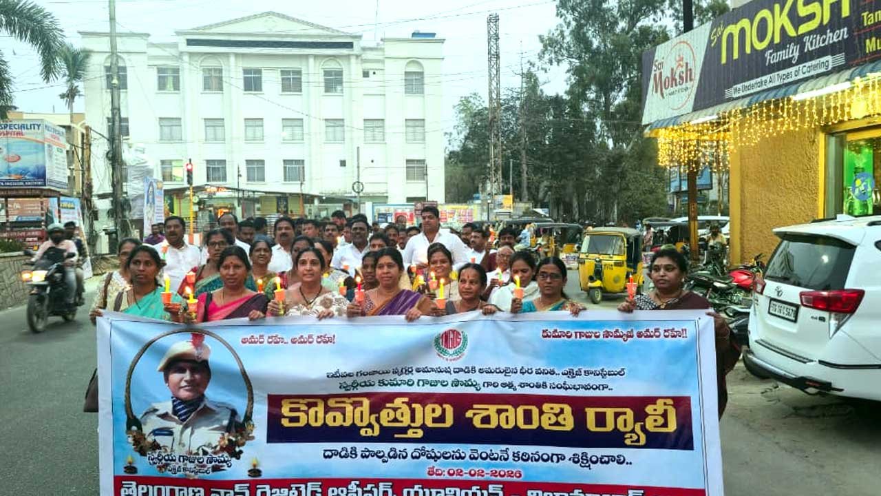 అక్షరటుడే, ఇందూరు: Constable Soumya | ఎక్సైజ్ కానిస్టేబుల్ గాజుల సౌమ్య (Constable Gajula Soumya) కుటుంబానికి టీఎన్జీవోస్ ఎల్లప్పుడు అండగా ఉంటుందని జిల్లా అధ్యక్ష కార్యదర్శులు సుమన్ కుమార్, శేఖర్ అన్నారు. జిల్లా కేంద్రంలోని ఎన్టీఆర్ చౌరస్తా నుంచి కోర్టు చౌరస్తా వరకు టీఎన్జీవో (TNGOs) ఆధ్వర్యంలో సోమవారం కొవ్వొత్తుల ర్యాలీ నిర్వహించారు.