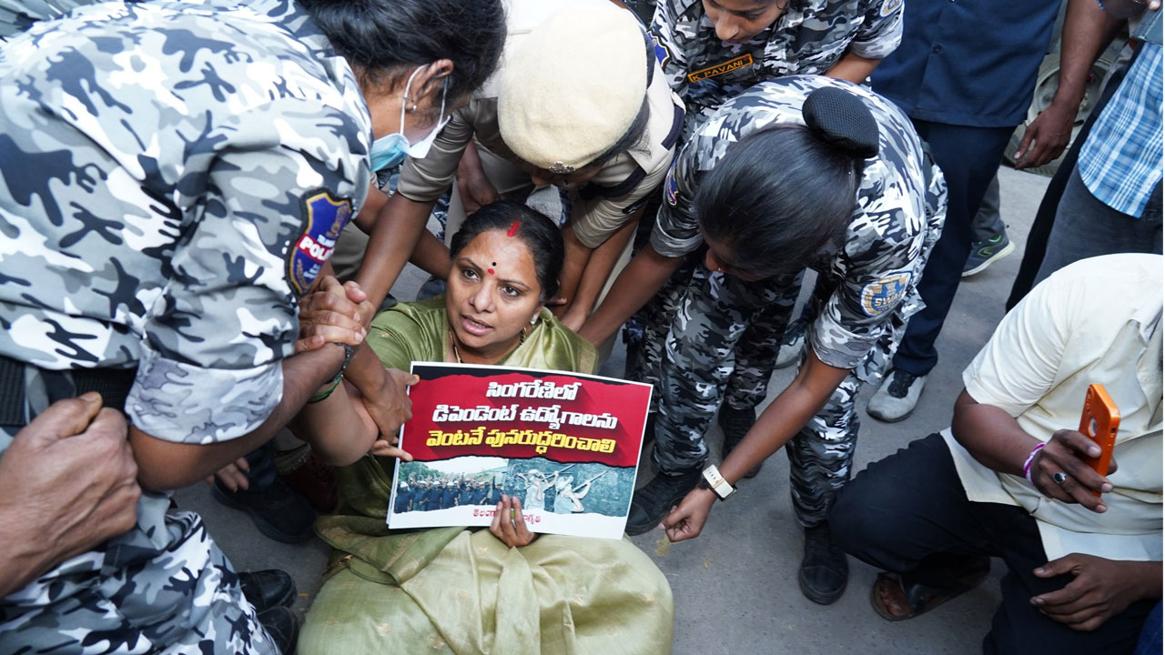 తెలంగాణ జాగృతి, హెచ్ఎంఎస్ (HMS) ఆధ్వర్యంలో సింగరేణి భవన్ ముట్టడి చేపట్టారు. కవిత మాట్లాడుతూ.. కొత్త ఉద్యోగాలు ఇవ్వకుండా ఉన్న డిపెండెంట్ ఉద్యోగాలు కూడా తీసేస్తున్నారు ఆగ్రహం వ్యక్తం చేశారు. రోడ్డుపై బైఠాయించి కవిత ఆందోళన చేపట్టారు. అయితే పోలీసులు ఆమెను అరెస్ట్ చేసి నాంపల్లి పోలీస్ స్టేషన్ (Nampalli Police Station)కు తరలించారు.
