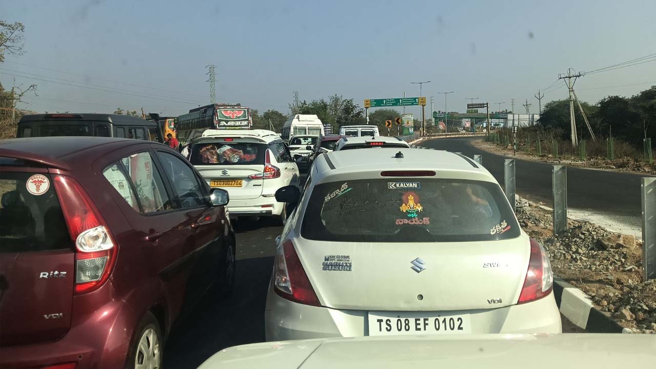 మేడారానికి వేలాదిగా వాహనాల్లో భక్తులు తరలి వెళ్తున్నారు. దీంతో ములుగు గట్టమ్మ తల్లి టెంపుల్ దగ్గర ట్రాఫిక్ జామ్ (Traffic Jam) అయింది. జకారం నుంచి మేడారం వరకు వాహనాల రద్దీ నెలకొంది. చింతల్ క్రాస్ వద్ద 3 కిలోమీటర్ల మేర వాహనాలు నిలిచిపోయాయి. వెంగళపూర్ నుంచి నార్లాపూర్ వరకు వాహనాలు ఆగిపోయాయి. 4 లక్షల మందికిపైగా భక్తులు తరలివచ్చినట్లు అధికారులు అంచనా వేస్తున్నారు. వాహనాలు నిలిచిపోవడంతో భక్తులు తీవ్ర ఇబ్బందులు పడుతున్నారు. పోలీసులు, అధికారులు ట్రాఫిక్ క్రమబద్దీకరణకు చర్యలు చేపడుతున్నారు. కన్నెపల్లి, జంపన్నవాగు, హరిత హోటల్ వరకు ట్రాఫిక్ స్తంభించింది. పొలాల్లో పార్కింగ్ కోసం వాహనాలను మళ్లిస్తున్నారు.