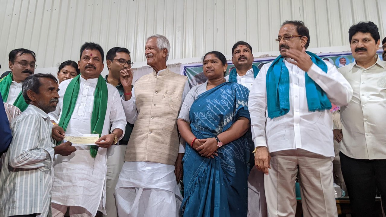 అక్షరటుడే, వెబ్డెస్క్ : Farmers | ములుగు (Mulugu) జిల్లా వాజేడు మండలంలో మొక్కజొన్న పంట నష్టపోయిన రైతులకు సోమవారం పరిహారం పంపిణీ చేశారు. కార్యక్రమంలో మంత్రులు సీతక్క (Seethakk), తుమ్మల నాగేశ్వరరావు(Tummala Nageswara rao), రైతు కమిషన్ సభ్యులు పాల్గొన్నారు. రైతు కమిషన్ ఛైర్మన్ కోదండరెడ్డి, సభ్యులు గడుగు గంగాధర్ (Gadugu Gangadhar), రాష్ట్ర విత్తనాభివృద్ధి సంస్థ ఛైర్మన్ అన్వేష్ రెడ్డి (Anvesh Reddy) తదితులు పాల్గొన్నారు. ములుగు జిల్లాకు వచ్చిన వీరిని మంత్రి సీతక్క సన్మానించారు. అనంతరం నష్టపోయిన రైతులకు చెక్కులు అందజేశారు.