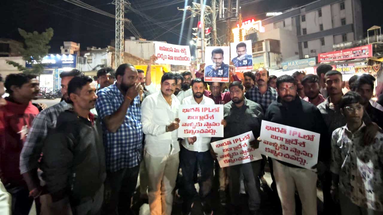 అక్షరటుడే, ఇందూరు: Bangladeshi players | ఐపీఎల్లో బంగ్లాదేశ్ క్రీడాకారులకు (Bangladeshi players) స్థానం కల్పించొద్దని హిందూ ఐక్యవేదిక ప్రతినిధి ప్రసాద్ పటేల్ డిమాండ్ చేశారు. ఈ మేరకు నిజామాబాద్ నగరంలోని (Nizamabad city) దేవీ రోడ్ చౌరస్తాలో బుధవారం రాత్రి నిరసన తెలిపారు.