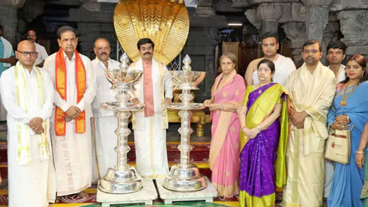 అక్షరటుడే, వెబ్డెస్క్ : Tirumala | తిరుమల(tirumala)లో కొలువుదీరిన కలియుగ దైవం వేంకటేశ్వర స్వామికి దాదాపు 300 ఏళ్ల తర్వాత అఖండాలను విరాళం ఇచ్చారు. తిరుమల శ్రీవారికి మైసూరు రాజమాత mysore rajamatha ప్రమోదా దేవి pramoda devi రెండు భారీ వెండి అఖండాల(అఖండ దీపాలు)ను సోమవారం విరాళంగా అందించారు. ఇవి గర్భగుడిలో వెలిగించే సంప్రదాయ దీపాలు. సుమారు 300 సంవత్సరాల క్రితం అప్పటి మైసూరు మహారాజు mysore king ఇలాంటి దీపాలను ఆలయానికి విరాళం ఇచ్చినట్లు చరిత్రలో ఉంది. ఇప్పుడు మళ్లీ మైసూరు రాజమాత వాటిని సమర్పించడం విశేషం. ఒక్కో వెండి అఖండం సుమారు 50 కిలోల బరువుంటుంది. తిరుమలలోని రంగనాయకుల మండపం Ranganayakula Mandapamలో ఆమె ఈ భారీ వెండి అఖండాలను టీటీడీ TTD కి అందించారు. కార్యక్రమంలో టీటీడీ ఛైర్మన్ బీఆర్ నాయుడు, అదనపు ఈవో వెంకయ్య చౌదరి పాల్గొన్నారు.