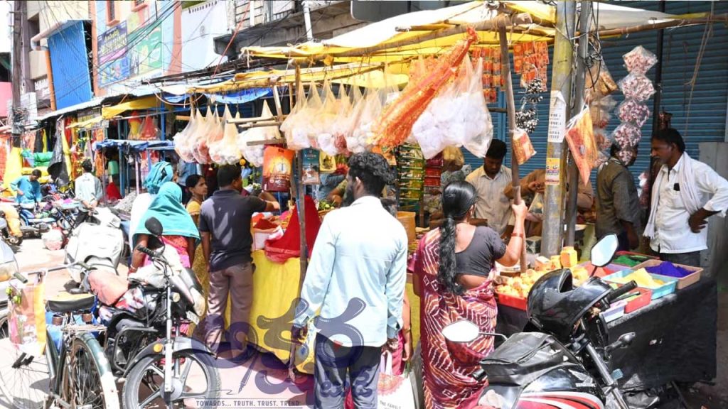 నిజామాబాద్ నగరంలో పూజాసామగ్రి కొనుగోలు చేస్తున్న ప్రజలు
