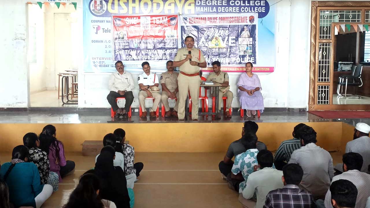 అక్షరటుడే, బోధన్ : Bodhan Traffic | ట్రాఫిక్ నియమ నిబంధనలపై ప్రతిఒక్కరికి అవగాహన ఉండాలని బోధన్ ఎస్హెచ్వో వెంకటనారాయణ (Bodhan SHO Venkatanarayana) అన్నారు. ‘అరైవ్ అలైవ్’ కార్యక్రమంలో భాగంగా పట్టణంలోని ఉషోదయ డిగ్రీ కళాశాలలో (Ushodaya Degree College) విద్యార్థులు ఉపాధ్యాయులకు ట్రాఫిక్ నియమాలపై అవగాహన కార్యక్రమం ఏర్పాటు చేశారు.