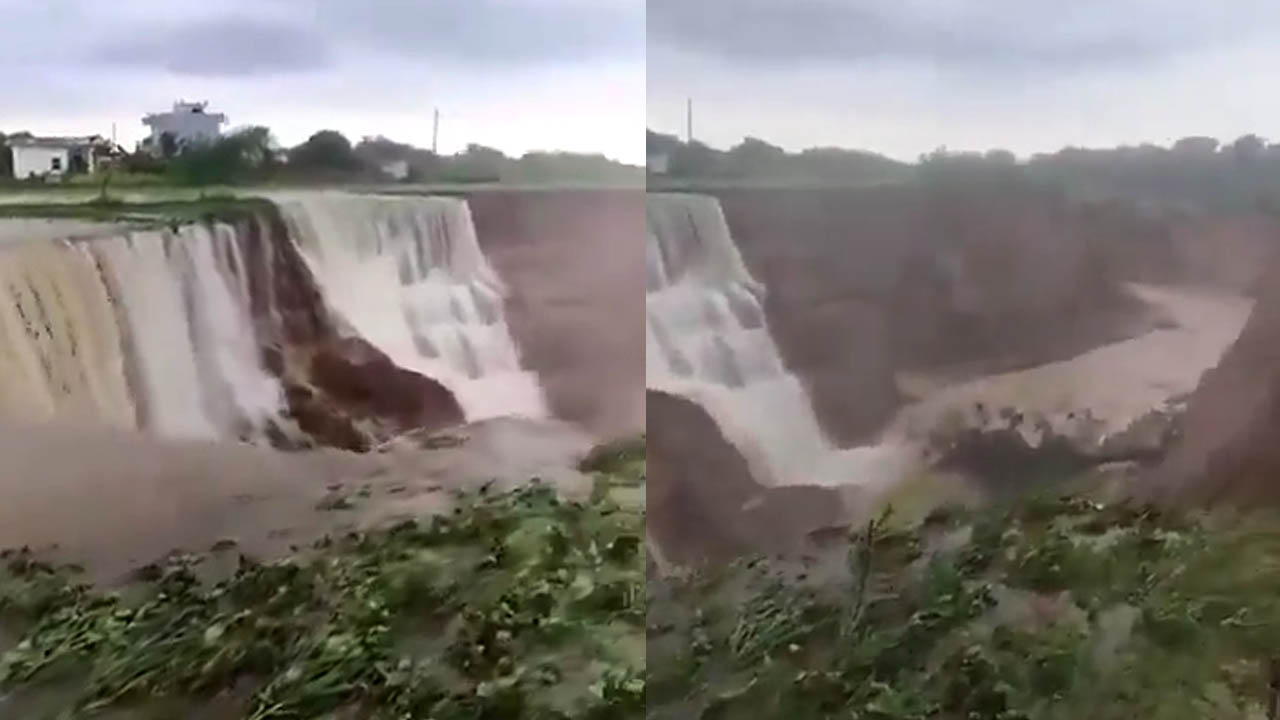 వర్షాలతో రాజస్థాన్లోని సుర్వాల్ జలాశయానికి (Surwal reservoir) భారీగా వరద వచ్చింది. దీంతో ప్రాజెక్ట్ పొంగి పొర్లింది. ఫలితంగా సవాయ్ మాధోపుర్ గ్రామంలో రెండు కిలోమీటర్ల మేర భారీ గొయ్యి ఏర్పడింది. చూడటానికి జలపాతంలా కనిపిస్తున్న ఈ గొయ్యితో సవాయ్ మాధోపుర్ గ్రామానికి (Sawai Madhopur village) రాకపోకలు నిలిచిపోయాయి. పంటలు కొట్టుకుపోయాయి. రెండు కిలోమీటర్ల పొడవు, వంద అడుగుల వెడల్పు, 55 అడుగుల లోతుతో గొయ్యి ఏర్పడినట్లు అధికారులు తెలిపారు.