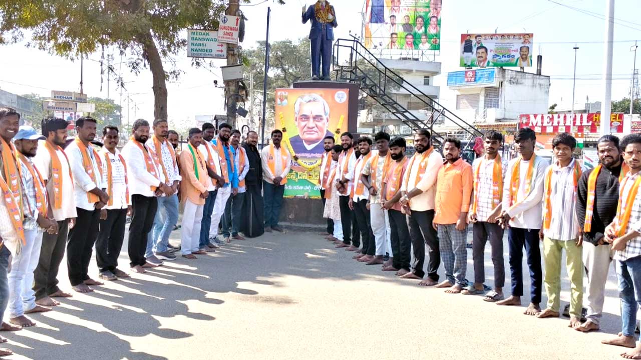 అక్షరటుడే, బోధన్ : Vajpayee Jayanti | భారత మాజీ ప్రధాని అటల్ బిహారీ వాజపేయి (Atal Bihari Vajpayee) జయంతిని బీజేపీ నాయకులు గురువారం ఘనంగా నిర్వహించారు. బోధన్ పట్టణ శాఖ ఆధ్వర్యంలో స్థానిక అంబేడ్కర్ చౌరస్తా వద్ద ఆయన చిత్రపటానికి పూలమాలలు వేసి నివాళులు అర్పించారు.