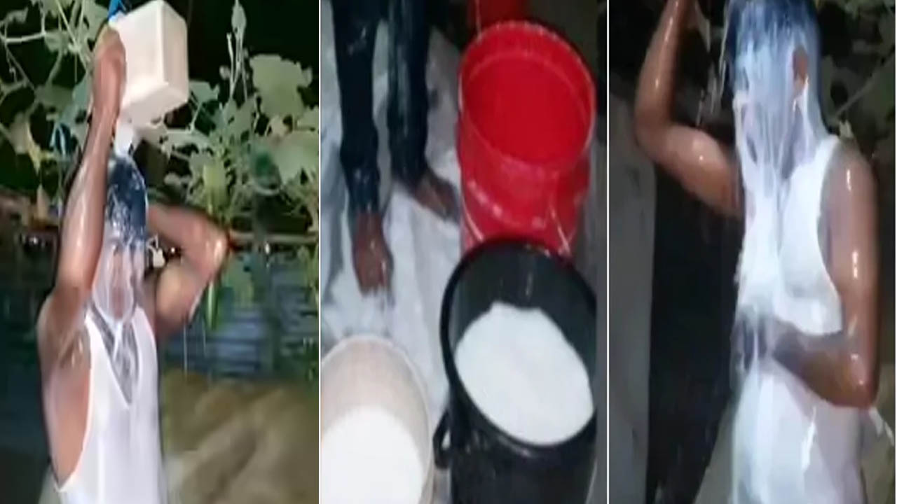 ఇంటి బయట.. నాలుగు బకెట్ల నిండా పాలు నింపుకుని.. ఒకదాని తర్వాత ఒకటి గుమ్మరించుకుంటూ అత్యంత ఉల్లాసంగా స్నానం చేస్తున్న వీడియో వైరల్ అవుతోంది. పాలతో స్నానం చేయడాన్ని కెమెరాలో రికార్డ్ చేశాడు. “ఈ రోజు నుంచి నేను ఫ్రీ” అంటూ కేరింతలు పెట్టడంపై నెటిజన్లు ఫుల్ కామెంట్స్ చేస్తున్నారు.