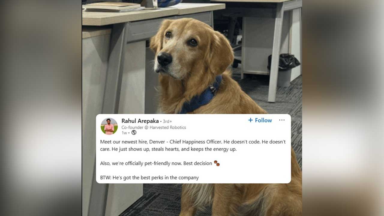 అయితే ఈ సంస్థ సహ వ్యవస్థాపకుడు రాహుల్ ఆరెపాక(Rahul Arepaka).. తన ఇన్స్టా ద్వారా తమ బృందంలో కొత్తగా చేరిన డెన్వర్ గురించి చెప్పుకొచ్చాడు. “మా కొత్త నియామకం, డెన్వర్ Denver … చీఫ్ హ్యాపీనెస్ ఆఫీసర్(Chief Happiness Officer). ఇతను కోడింగ్ చేయడు. దేని గురించీ పెద్దగా పట్టించుకోడు. కేవలం ఆఫీస్కు మాత్రమే వస్తాడు, అందరి మనసులని మాత్రం దోచేస్తాడు, వాతావరణాన్ని ఉత్సాహంగా ఉంచుతాడు. అంతేకాకుండా, మేము ఇప్పుడు అధికారికంగా పెట్-ఫ్రెండ్లీ ఆఫీస్గా మారాము. ఇది మేము తీసుకున్న అత్యుత్తమ నిర్ణయం.మరో ముఖ్య విషయం ఏంటంటే.. మా కంపెనీలో అత్యుత్తమ సౌకర్యాలు అతనికే ఉన్నాయి అంటూ రాహుల్ ఆరెపాక పేర్కొన్నారు. రాహుల్ పెట్టిన ఈ పోస్ట్కు వేల సంఖ్యలో లైకులు, అంతకు మించి ప్రేమపూర్వక అభినందనలు వెల్లువెత్తుతున్నాయి.