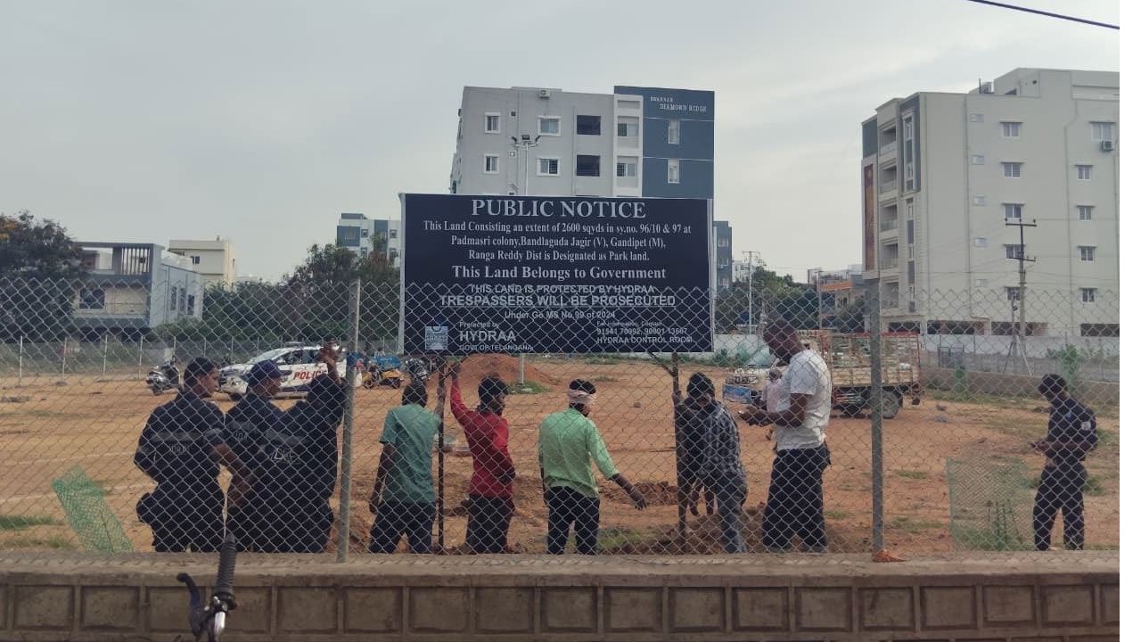 రంగారెడ్డి (Rangareddy) జిల్లా గండిపేట మండలం బండ్లగూడ జాగీర్ మున్సిపాలిటీలో రెండు పార్కులను హైడ్రా కాపాడింది. పద్మశ్రీ హిల్స్ కాలనీలోని 2,600 గజాల పార్కు స్థలాన్ని రక్షించింది. 1983లో 10 ఎకరాల విస్తీర్ణంలో 230 ప్లాట్లతో లే ఔట్ వేయగా.. ఇందులో 2,600 గజాల స్థలాన్ని పార్కుకోసం కేటాయించారు. బండ్లగూడ జాగీర్ మున్సిపాలిటీ అధికారులు ఈ పార్కు చుట్టూ ప్రహరీ నిర్మించి అభివృద్ధి చేయడానికి ప్రయత్నించగా.. పక్కనే ల్యాండ్ ఉన్న వారు ఈ స్థలం తనదంటూ అడ్డుకోవడంతో ఆ పనులు ఆగిపోయాయి. పద్మశ్రీనగర్ కాలనీ నివాసితులు హైడ్రాకు ఇదే విషయాన్ని ఫిర్యాదు చేయగా.. స్థానిక రెవెన్యూ, మున్సిపాలిటీ అధికారులతో క్షేత్రస్థాయిలో పరిశీలించి పార్కుకు కేటాయించిన స్థలంగా హైడ్రా నిర్ధారించుకుంది. శనివారం పార్కు స్థలం చుట్టూ ఫెన్సింగ్ ఏర్పాటు చేసి హైడ్రా బోర్డులను ఏర్పాటు చేసింది.