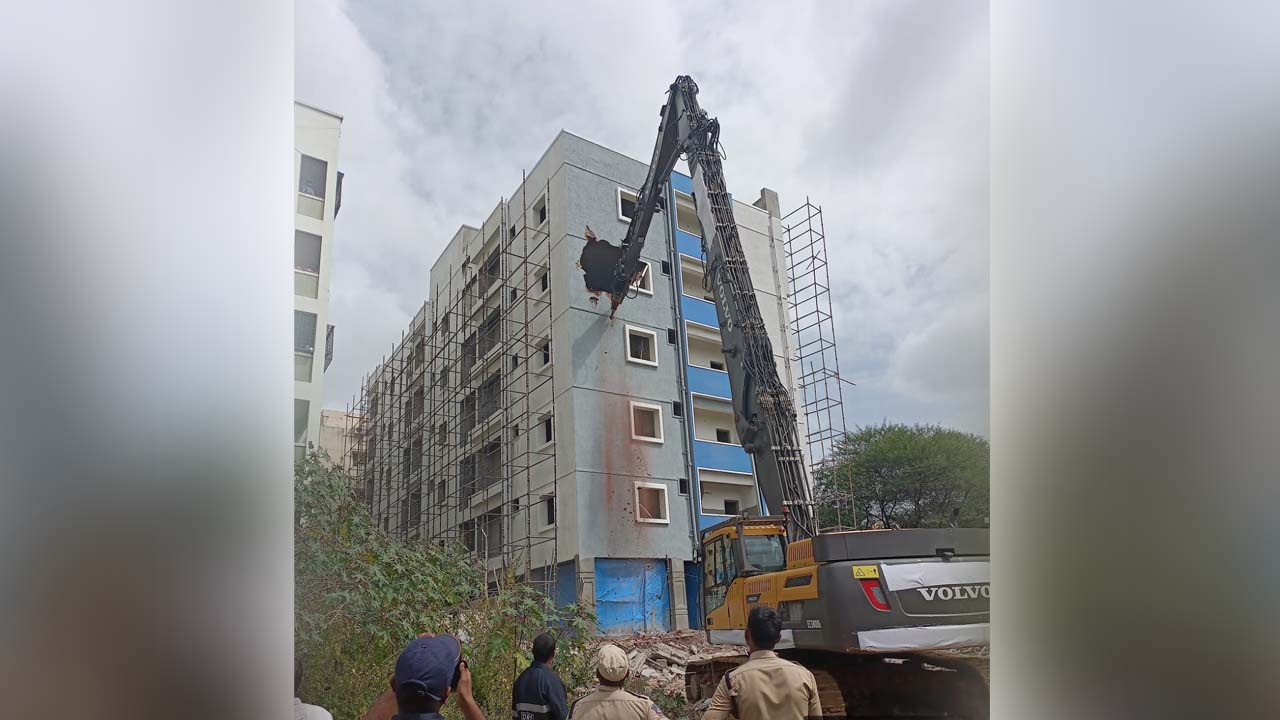 సంగారెడ్డి జిల్లా (Sangareddy District) అమీన్పూర్ మున్సిపాలిటీ పరిధిలో శనివారం ఉదయం హైడ్రా కూల్చివేతలు చేపట్టింది. పీజేఆర్ కాలనీ, మియాపూర్ సరిహద్దు ప్రాంతంలో ఐదంతస్తుల అపార్ట్మెంట్ను హైడ్రా అధికారులు (Hydraa Officers) కూల్చివేశారు. అమీన్పూర్ సర్వే నంబర్ 337, 338లలో హుడా అప్రూవ్డ్ లే అవుట్ లో 400 గజాల ప్లాట్ కొని.. పక్కనే మియాపూర్ సర్వే నంబర్ 101లోని దాదాపు 473 గజాలు ఆక్రమించి భాను కన్స్ట్రక్షన్ యజమానులు 5 అంతస్తుల భవనం నిర్మించారు. దీనిపై స్థానికులు ప్రజావాణి (Prajavani)లో ఫిర్యాదు చేశారు. క్షేత్రస్థాయిలో విచారణ చేపట్టిన హైడ్రా అధికారులు ఆక్రమణలు నిజమని తేల్చారు. దీంతో శనివారం ఉదయం ఆ భవనాన్ని కూల్చి వేశారు. కూల్చివేతల సందర్భంగా ఎలాంటి ఘటనలు చోటు చేసుకోకుండా భారీగా పోలీసులు మోహరించారు.