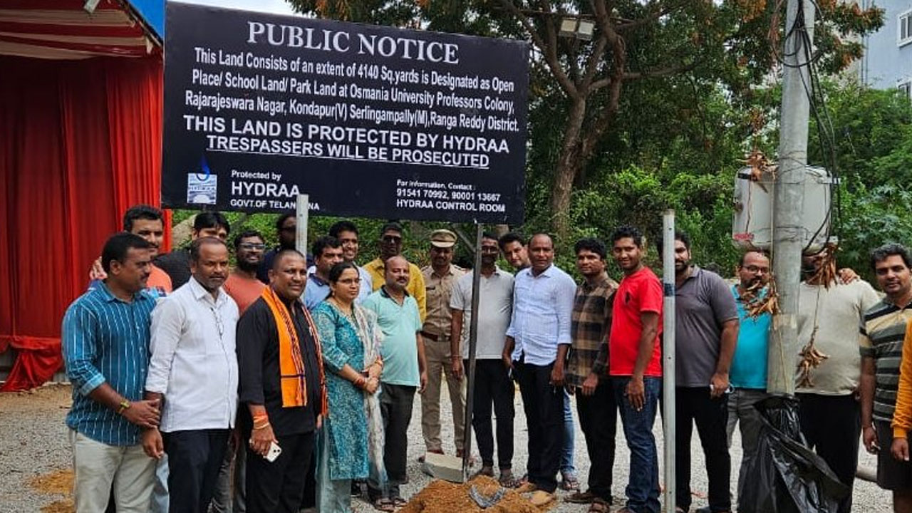 రంగారెడ్డి (Rangareddy) జిల్లా శేరిలింగంపల్లి మండలం కొండాపూర్లోని రాఘవేంద్రనగర్లో 2000 గజాల పార్కు స్థలాన్ని హైడ్రా శుక్రవారం కాపాడింది. రాజేశ్వరి నగర్లో 4300 గజాల స్థలానికి శనివారం విముక్తి కల్పించింది. రాజరాజేశ్వరి నగర్లోని ఉస్మానియా యూనివర్సిటీ టీచర్స్ వెల్ఫేర్ సొసైటీలో 4300 గజాల స్థలాన్ని కొందరు ఆక్రమించారు. ఇక్కడ 1978 లే అవుట్ వేశారు. మొత్తం 350 ప్లాట్లు ఉండగా.. 4300 గజాల స్థలాన్ని ప్రజావసరాల కోసం వదిలేశారు. అయితే ఆ స్థలాన్ని కొందరు తప్పుడు డాక్యుమెంట్లు సృష్టించి ఆక్రమించారు. ఇదే విషయాన్ని కాలనీ ప్రతినిధులు హైడ్రా ప్రజావాణిలో ఫిర్యాదు చేశారు.