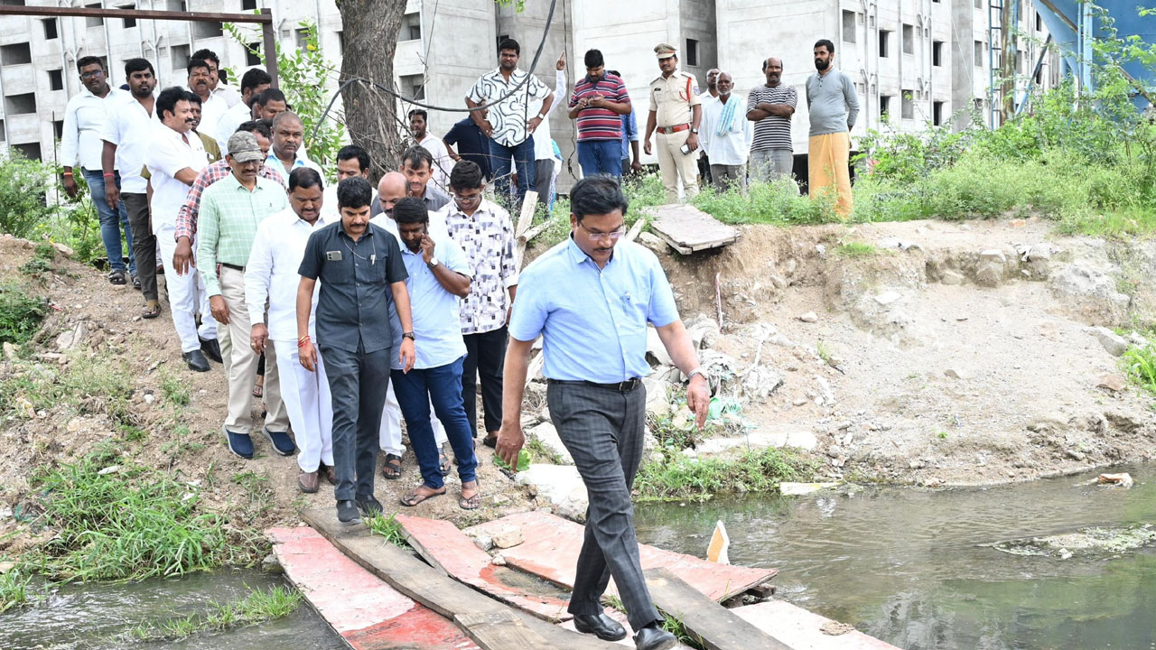 మాసబ్ చెరువు(Masab Pond) – దిలావర్ఖాన్ చెరువుల మధ్య నాలా సరిగ్గా లేక అనేక కాలనీలు నీట మునుగుతున్నాయనే ఫిర్యాదుల నేపథ్యంలో ఇబ్రహీంపట్నం ఎమ్మెల్యే మల్రెడ్డి రంగారెడ్డితో (MLA Malreddy Rangareddy) కలిసి కమిషనర్ బుధవారం పలు ప్రాంతాలను పరిశీలించారు.