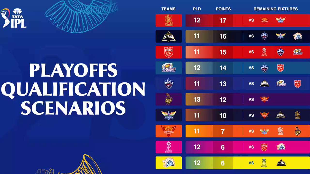 ఇక లక్నో సూపర్ జెయింట్స్ ప్లేఆఫ్స్కు (luknow super gaints Play offs) అర్హత సాధించాలంటే.. లక్నో జట్టు ఇప్పటి వరకు 11 మ్యాచ్లు ఆడింది. ఇందులో 5 మ్యాచ్ల్లో విజయం సాధించగా, మరో 6 మ్యాచ్ల్లో ఓడిపోయింది. 10 పాయింట్లు ఆ జట్టు ఖాతాలో ఉన్నాయి. నెట్రన్రేట్ -0469గా ఉంది. ప్రస్తుతం పాయింట్ల పట్టికలో ఏడో స్థానంలో ఉంది. లక్నో మరో మూడు మ్యాచ్లు సన్రైజర్స్ హైదరాబాద్, గుజరాత్ టైటాన్స్, రాయల్ ఛాలెంజర్స్ బెంగళూరు (gujarath titans and royal challengers bangalore)జట్లతో ఆడాల్సి ఉంది. ఈ మూడు మ్యాచ్ల్లోనూ విజయం సాధించినా కూడా మిగిలిన జట్ల ఫలితాలపై ఆధారపడాల్సి ఉంటుంది. మిగిలిన మూడు మ్యాచ్ల్లో గెలిస్తే.. లక్నో ఖాతాలో 16 పాయింట్లు వస్తాయి. అదే సమయంలో ముంబైని ఢిల్లీ ఓడించాలి, పంజాబ్ చేతిలో ఓడిపోవాలి. ముంబై తమ చివరి రెండు మ్యాచ్ల్లోనూ ఓడిపోవాలి. అప్పుడు లక్నోకి 16 పాయింట్లు, ఢిల్లీకి 15 పాయింట్లు, ముంబైకి 14 పాయింట్లు ఉంటాయి. మరి ఏం జరుగుతుందో చూడాలి.