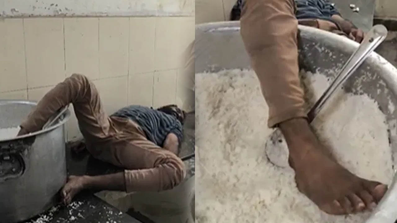కాగా, ఇతడో పెద్ద తాగుబోతు. ఈ క్రమంలోనే ఇటీవల ఫూటుగా మద్యం తాగాడు. భోజనాలు వడ్డించే ప్లాట్ఫామ్పై ఉన్న అన్నం బానాలీ(గిన్నె)లో డర్టీగా ఉన్న తన కాలును పెట్టి గాఢ నిద్రలో మునిగిపోయాడు.