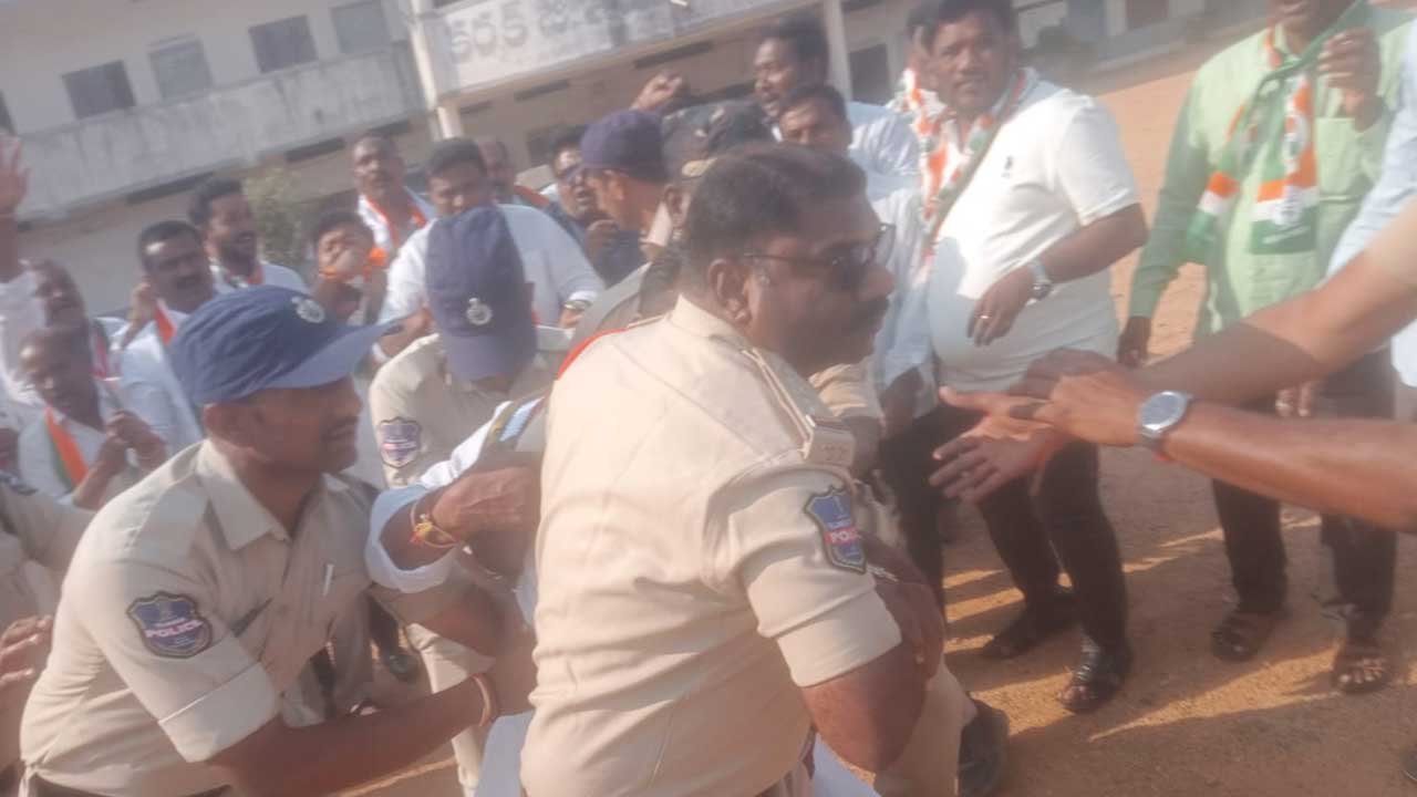 కాంగ్రెస్ నాయకులు భారీ సంఖ్యలో కళాశాల గ్రౌండ్ వద్దకు చేరుకోగా పోలీసులు అడ్డుకున్నారు. పోలీసులకు, కాంగ్రెస్ నాయకులకు మధ్య వాగ్వాదం చోటుచేసుకుంది. దాంతో నాయకులను పోలీసులు అరెస్ట్ చేసి డీసీఎం వ్యానుల్లో పోలీస్ స్టేషన్కు తరలించారు. మరోవైపు ఎమ్మెల్యే క్యాంప్ కార్యాలయం (MLA Camp Office) వద్ద పోలీసులు బందోబస్తు చేపట్టారు. దాంతో ఎమ్మెల్యేను హౌస్ అరెస్ట్ చేశారని ప్రచారం సాగినా అదంతా ఏమి లేదని పోలీసులు తెలిపారు. క్యాంప్ కార్యాలయం వద్ద అవాంఛనీయ ఘటనలు జరగకుండా బందోబస్తు చేపట్టినట్టు పోలీసులు తెలిపారు.