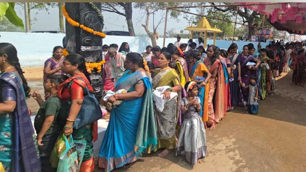 భీమ్గల్ మండలం బడాభీంగల్ లోని రాజరాజేశ్వర స్వామి ఆలయంలో దర్శనం కోసం బారులు తీరిన భక్తులు