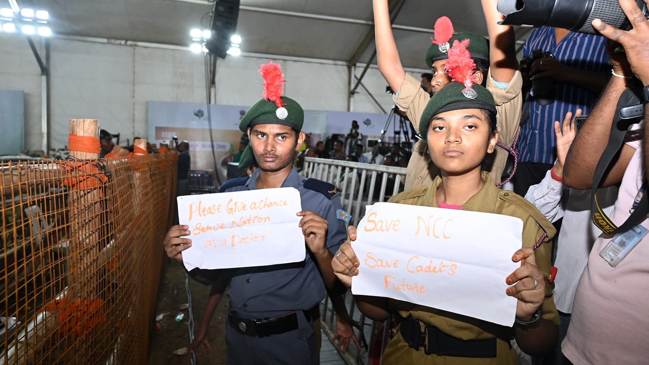 ఎంబీబీఎస్లో (MBBS) ఒక్కశాతం ఎన్సీసీ కోటా రిజర్వేషన్ను గతంలో తీసివేశారని పేర్కొన్నారు. తిరిగి రిజర్వేషన్ కల్పించాలంటూ ఫ్లకార్డులను ప్రదర్శించారు. దీంతో అక్కడికి చేరుకున్న పోలీసులు వారిని బయటికి పంపించేశారు. ఎన్సీసీ విద్యార్థులంతా వరంగల్ నుంచి వచ్చినట్లు తెలిసింది.