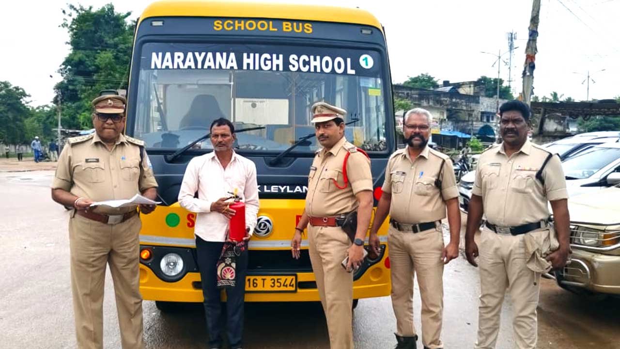 నిబంధనలు పాటించని ఓ స్కూల్ బస్సుపై (school bus) కేసు నమోదు చేసినట్లు ఎంవీఐ శ్రీనివాస్ పేర్కొన్నారు. ఈ సందర్భంగా ఆయన మాట్లాడుతూ.. ట్రావెల్స్, స్కూల్ బస్సులు తప్పనిసరిగా నిబంధనలు పాటించాల్సి ఉంటుందన్నారు. లేకపోతే తనిఖీల్లో భాగంగా జరిమానాలు విధిస్తామని, కేసులు నమోదు చేస్తామని హెచ్చరించారు. ఆయనతో పాటు టౌన్సీఐ వెంకట నారాయణ (Town CI Venkata Narayana) తనిఖీల్లో పాల్గొన్నారు.