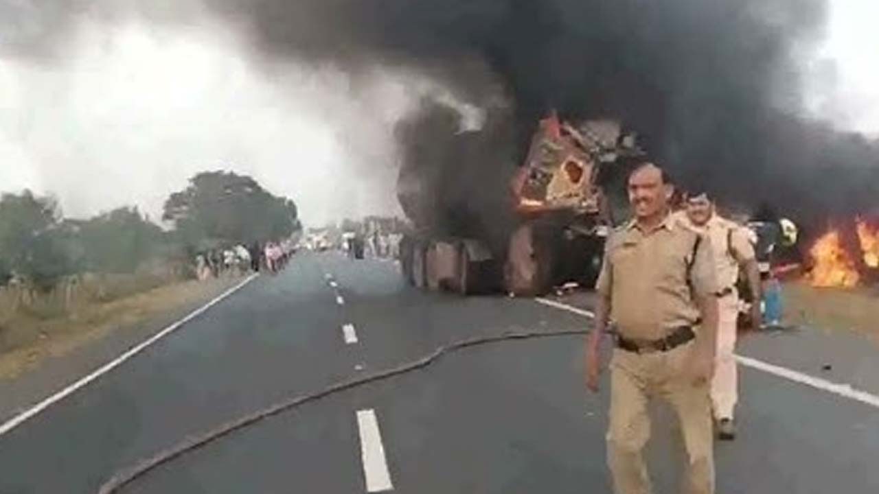 వివరాల ప్రకారం, అనంతపురం నుంచి టమాటా లోడ్తో రాజమండ్రి (Rajamundry) దిశగా వస్తున్న లారీ పెంచికలపాడు వద్దకు చేరుకున్న సమయంలో ఒక్కసారిగా దాని టైరు పేలిపోయింది. టైరు పగిలిన ప్రభావంతో లారీ అదుపు కోల్పోయి ఎదురుగా వస్తున్న ఆయిల్ ట్యాంకర్ (Oil Tanker)పై దూసుకెళ్లింది. బలంగా ఢీకొట్టడం వలన టమాటాతో నిండిన లారీ బోల్తా పడింది. ఇక ఆయిల్ ట్యాంకర్ ముందుభాగం పూర్తిగా ఛిద్రమైంది. ఈ ప్రమాదంలో ఆయిల్ ట్యాంకర్ డ్రైవర్ పైడికొండల దుర్గారావు (40) క్యాబిన్లోనే ఇరుక్కుపోయారు. ఢీకొట్టిన కొన్ని క్షణాల్లోనే ట్యాంకర్లో మంటలు చెలరేగి వేగంగా వ్యాపించాయి. బయటకు రావడానికి మార్గం లేకపోవడంతో డ్రైవర్ సజీవదహనమై అక్కడికక్కడే మృతి చెందారు. మృతుడు పశ్చిమ గోదావరి జిల్లా దేవరపల్లి (Devarapalli) పట్టణానికి చెందినవారని పోలీసులు గుర్తించారు.