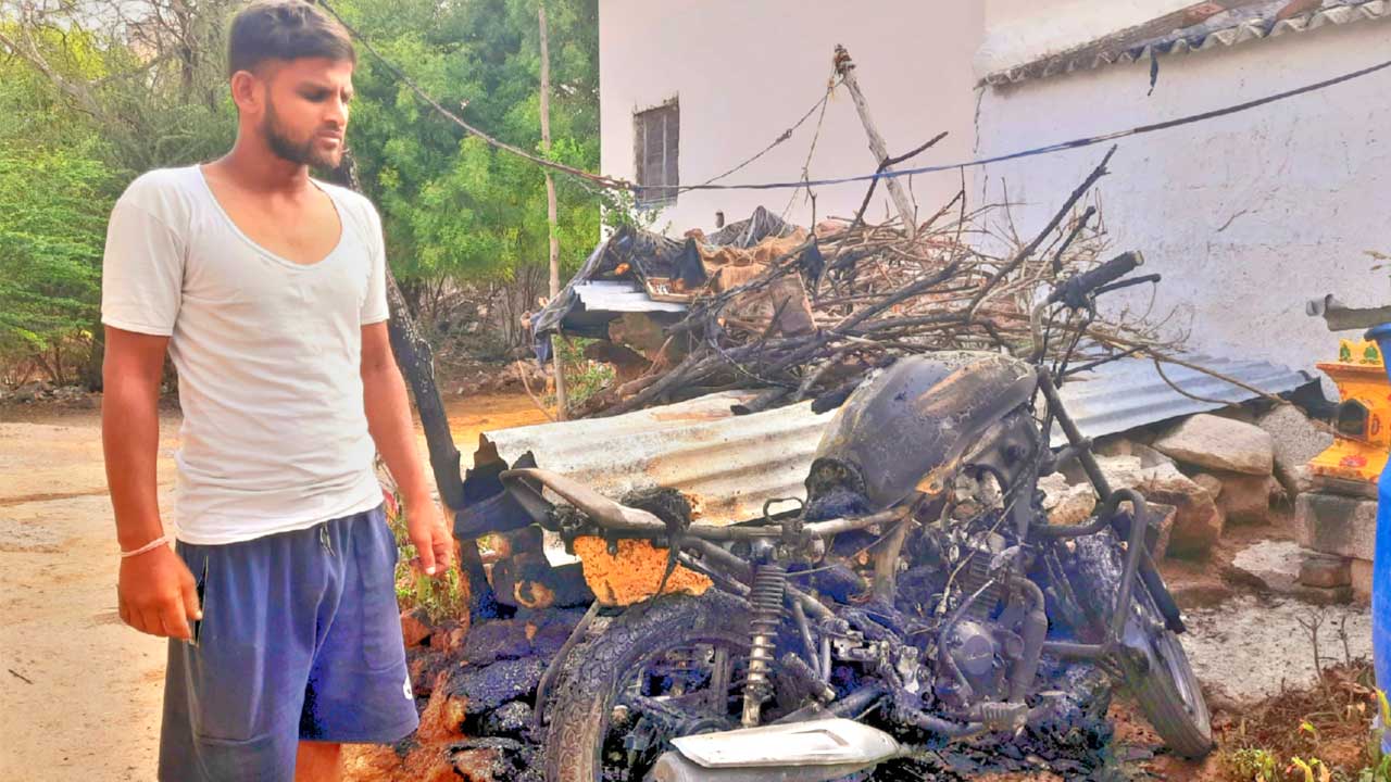 అక్షరటుడే, కోటగిరి: ఇంటి ఎదుట పార్క్ చేసిన బైక్ను గుర్తు తెలియని వ్యక్తులు దగ్ధం చేసిన ఘటన కోటగిరి (Kotagiri)మండల కేంద్రంలో గురువారం అర్ధరాత్రి చోటు చేసుకుంది. స్థానికులు తెలిపిన వివరాల ప్రకారం.. మండల కేంద్రంలోని ఎస్సీ కాలనీలో నివసించే పోతురాజు శ్రీనివాస్ నాలుగు నెలల క్రితం హోండాషైన్ (Honda Shine Bike) వాహనం కొన్నాడు. ఎప్పటిలాగే గురువారం తన ఇంటి ఎదుట బైక్ను పార్క్ చేసి ఉంచాడు. తెల్లవారుజామున బైక్ తగలబడుతున్న విషయాన్ని పక్కింటివాళ్లు గమనించి శ్రీనివాస్కు తెలియజేశారు. వెంటనే మంటలను ఆర్పినప్పటికీ అప్పటికే బైక్ పూర్తిగా తగలబడి పోయింది.