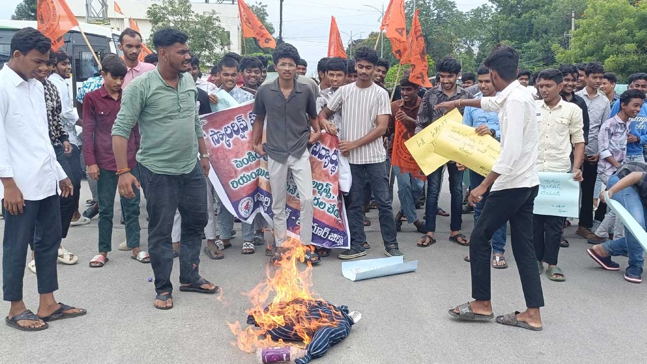 అక్షరటుడే, ఇందూరు: Scholarships | పెండింగ్లో ఉన్న మెస్ బకాయిలు, స్కాలర్షిప్ విడుదల చేయాలని ఏబీవీపీ (ABVP) జిల్లా కన్వీనర్ బాలకృష్ణ డిమాండ్ చేశారు. శుక్రవారం నగరంలోని ఎన్టీఆర్ చౌరస్తాలో (NTR Couwrastha) ప్రభుత్వ దిష్టిబొమ్మను దహనం చేశారు. ఈ సందర్భంగా ఆయన మాట్లాడుతూ.. డిగ్రీ, పీజీ విద్యార్థులకు స్కాలర్షిప్, ఫీజు రియంబర్స్మెంట్ రాకపోవడంతో తీవ్ర ఇబ్బందులు ఎదురవుతున్నాయన్నారు. దీంతో పేద, బడుగు బలహీన వర్గాలకు చెందిన విద్యార్థులు చదువుపై దృష్టి పెట్టలేకపోతున్నారని పేర్కొన్నారు. బకాయలు విడుదల కాకపోవడంతో విద్యార్థుల నుంచి కళాశాలలు డబ్బులు వసూలు చేస్తున్న పరిస్థితి నెలకొందన్నారు.
