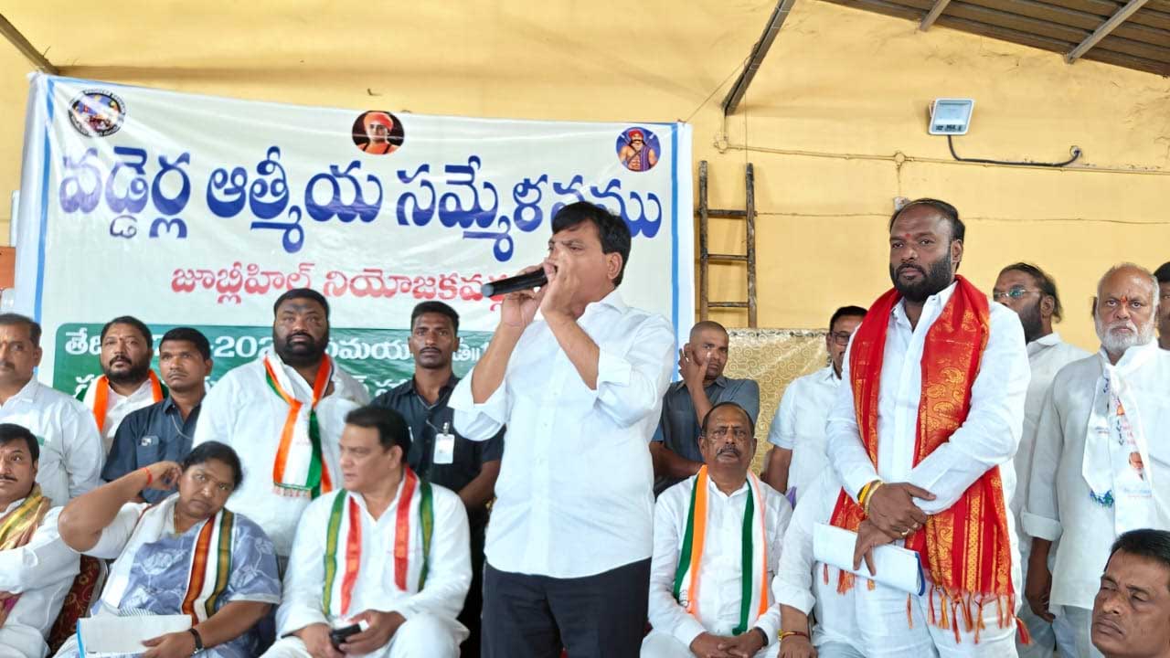 జూబ్లీహిల్స్ నియోజకవర్గంలోని (Jubilee Hills constituency) బోరబండ జయశంకర్ కమ్యూనిటీ హాల్లో జాతీయ వడ్డెర సంఘం జాతీయ అధ్యక్షుడు, బాన్సువాడ వాస్తవ్యుడు పిట్ల శ్రీధర్ అధ్యక్షతన వడ్డెరల ఆత్మీయ సమ్మేళనం నిర్వహించారు. కార్యక్రమానికి ముఖ్య అతిథులుగా విచ్చేసిన మంత్రులు పొంగులేటి, సీతక్క, అజారుద్దీన్ మాట్లాడుతూ.. హైదరాబాద్లో వడ్డెర కులస్థుల కోసం ఐదెకరాల భూమిని కేటాయిస్తామన్నారు.