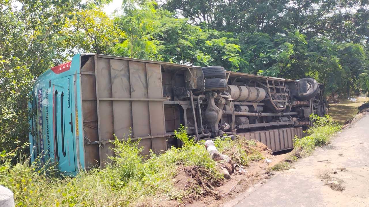 స్థానికులు, బాధితుల కథనం ప్రకారం.. కామారెడ్డి పట్టణ శివారులోని సిరిసిల్ల బైపాస్ (Sircilla Bypass) ఆవరణలో జాతీయ రహదారిపై అదుపు తప్పి ప్రైవేట్ బస్సు బోల్తా పడింది. బస్సు బోల్తాపడిన చోట ఇటీవల వర్షాలకు రహదారి కోతకు గురైంది. దాంతో రోడ్డు పక్కన ఓ కుంటలో బస్సు బోల్తా పడింది.
