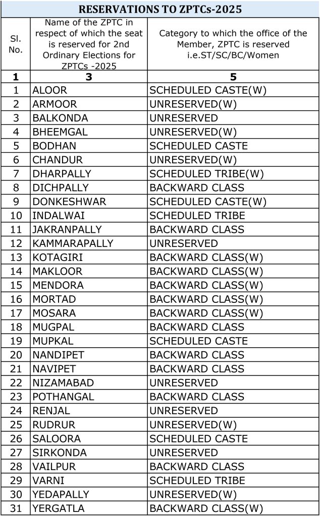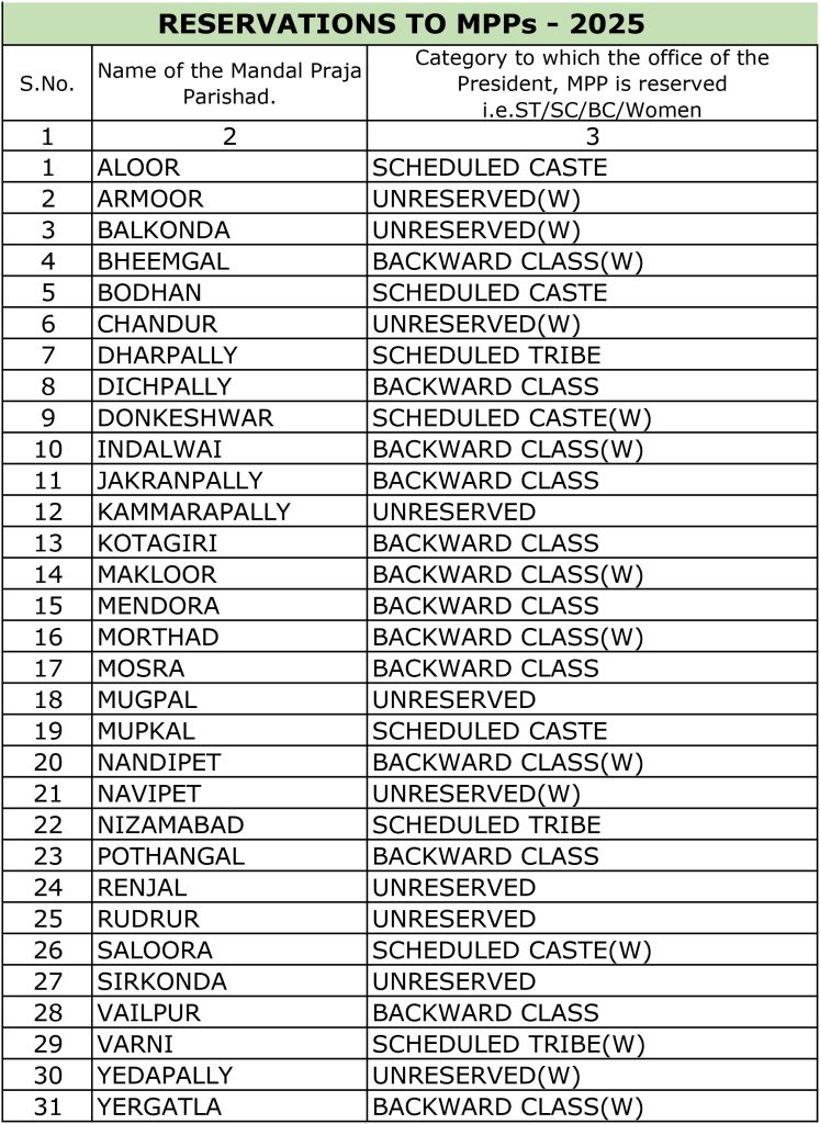 అక్షరటుడే, ఇందూరు: Local Body Elections | స్థానిక సంస్థల ఎన్నికల నిర్వహణ, రిజర్వేషన్లపై ప్రభుత్వ కసరత్తు కొలిక్కివచ్చింది. నిజామాబాద్ జిల్లాలో (Nizamabad) జెడ్పీటీసీ(ZPTC), ఎంపీపీ (MPP) స్థానాల రిజర్వేషన్లపై ఉత్కంఠతో ఎదురుచూస్తున్న రాజకీయ పార్టీ నాయకులకు ఊరట లభించింది.