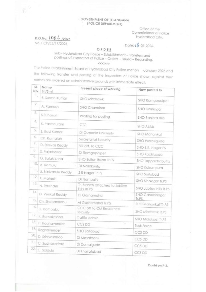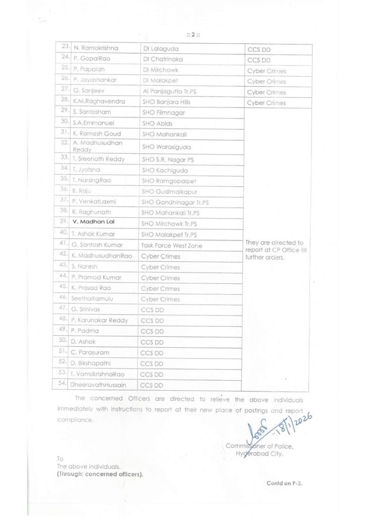 అక్షరటుడే, వెబ్డెస్క్: Inspectors Transfer | హైదరాబాద్ కమిషనరేట్ (Hyderabad Commissionerate) పరిధిలో పలువురు ఇన్స్పెక్టర్లు బదిలీ అయ్యారు. ఈ మేరకు నగర కమిషనర్ సజ్జనార్ (Commissioner Sajjanar) ఉత్తర్వులు జారీ చేశారు.నగరంలోని పలు ఠాణాల్లో ఎస్హెచ్వోలుగా పని చేస్తున్న వారితో పాటు డీఐలు, సైబర్ క్రైమ్, సీసీఎస్లో పని చేస్తున్న వారికి సీపీ స్థానం చలనం కలిగించారు.