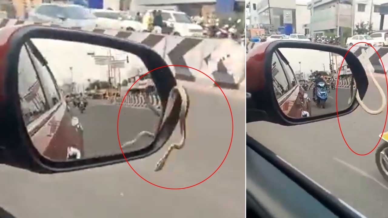 ప్రయాణంలో గాలి వేగం తగలడంతో అద్దం వెనుకనుంచి పాము బయటకొచ్చింది.
