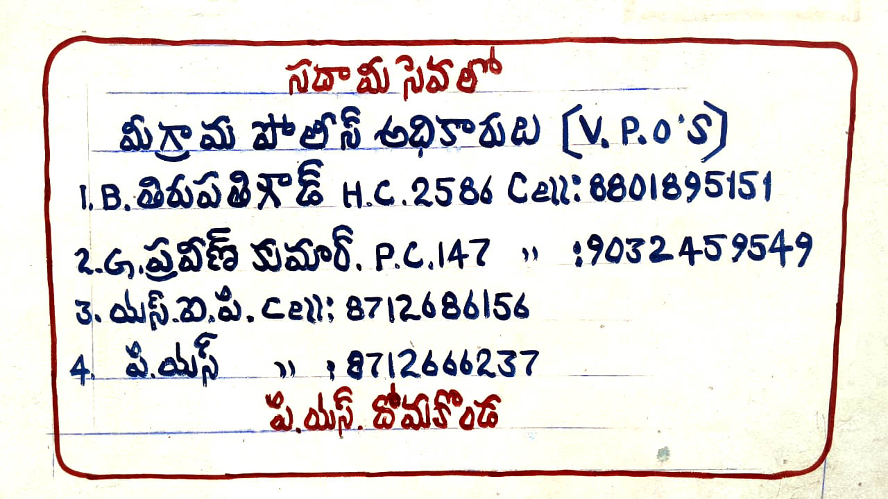 ప్రతి అధికారి వద్ద గ్రామ, వార్డులకు సంబంధించిన పూర్తి సమాచారం ఉండాలని ఆదేశాలు జారీ చేశారు. ప్రస్తుతం గ్రామ పోలీస్ వ్యవస్థ పటిష్టం చేయడంతో పాటు ప్రజలకు పోలీసు వ్యవస్థను మరింత చేరువ చేయడం కోసం ఆయా గ్రామాల్లో సంబంధిత గ్రామ పోలీసు, ఎస్సై, పోలీస్ స్టేషన్ (police station) నంబర్లను పెయింటింగ్ ద్వారా ప్రజలకు తెలియజేస్తున్నారు. దాంతో సాధారణ పౌరుడు సైతం గ్రామాల్లో ఏమి జరిగినా పోలీసులకు సమాచారం ఇచ్చే వెసులుబాటు కల్పించారు. ప్రజల భద్రతకు తామున్నామనే భరోసా కల్పిస్తున్నారు. సమస్య ఏదైనా తమను నేరుగా సంప్రదించవచ్చని ప్రజలకు ఎస్పీ సూచిస్తున్నారు.
