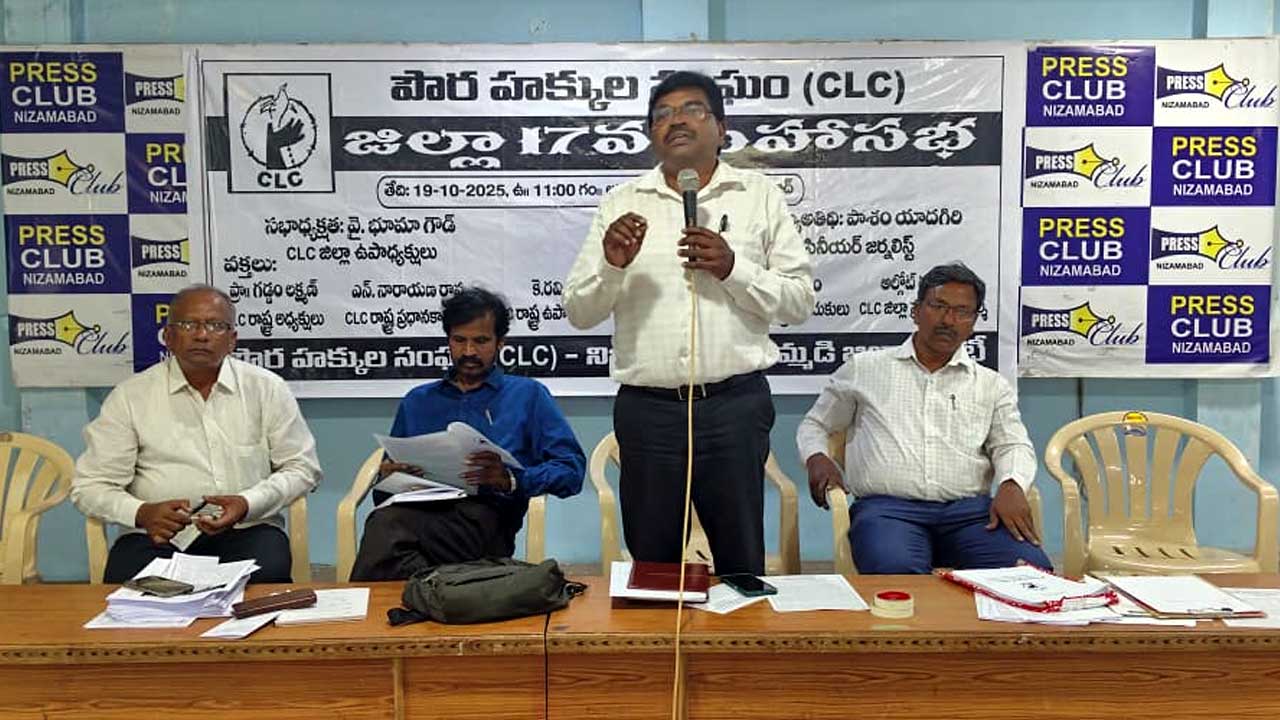 అక్షరటుడే, ఇందూరు: CLC | ఐదు దశాబ్దాలుగా ఉమ్మడి ఆంధ్రప్రదేశ్తోపాటు ప్రత్యేక తెలంగాణలో (telangana) పౌర హక్కుల కోసం సీఎస్సీ బలమైన పోరాటం చేస్తోందని ఆ సంఘం రాష్ట్ర అధ్యక్ష, కార్యదర్శులు ప్రొఫెసర్ గడ్డం లక్ష్మణ్, ఎన్ నారాయణరావు అన్నారు. నగరంలోని ప్రెస్క్లబ్లో ఆదివారం సీఎల్సీ (పౌరహక్కుల సంఘం) (Civil Rights Association) ఉమ్మడి జిల్లా 17వ మహాసభ నిర్వహించారు.