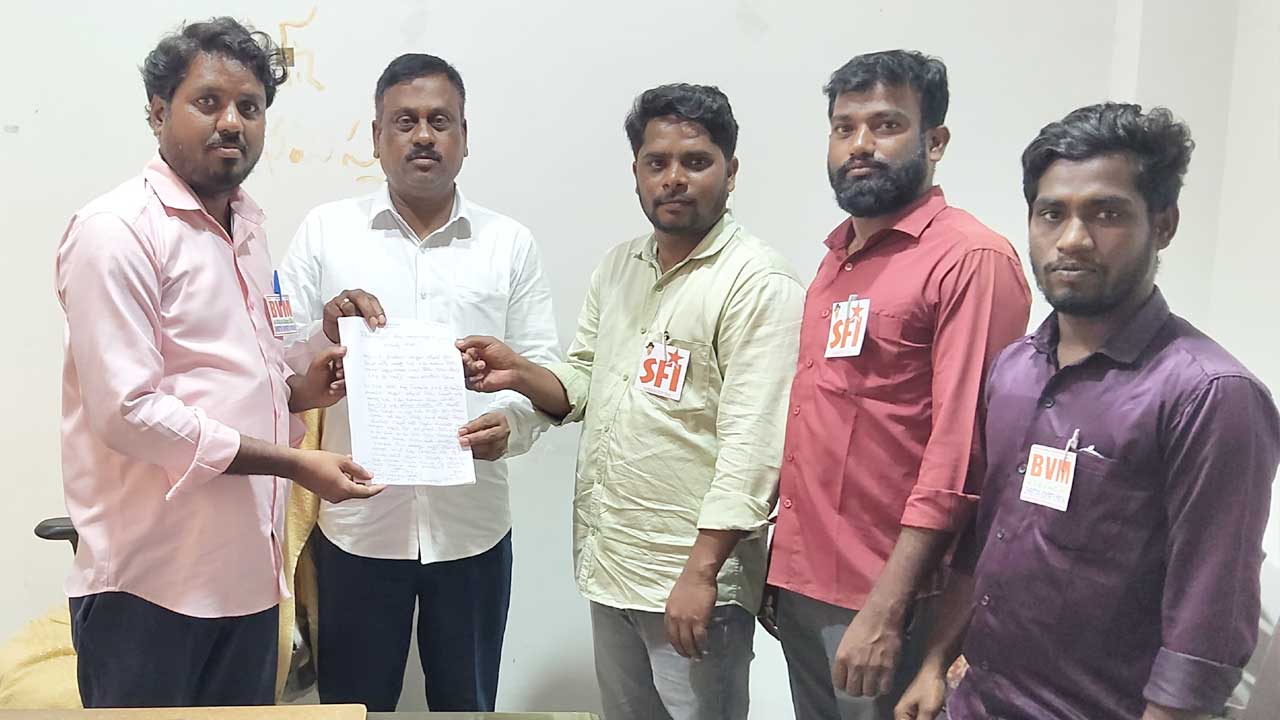 అడ్మిషన్ పేరుతో వసూలు చేసిన రూ. 5వేలను విద్యార్థులకు తిరిగి ఇవ్వాలని, లేనిపక్షంలో విద్యార్థి సంఘాల ఆధ్వర్యంలో పెద్ద ఎత్తున ఆందోళన చేస్తామని హెచ్చరించారు. కార్యక్రమంలో ఎస్ఎఫ్ఐ (SFI) జిల్లా కార్యదర్శి అరుణ్ కుమార్, బీవీఎం(BVM) రాష్ట్ర కార్యదర్శి విఠల్, నాయకులు శ్యామ్, టింకు, స్టాలిన్, మనోజ్, సూఫీయాన్ తదితరులు పాల్గొన్నారు.