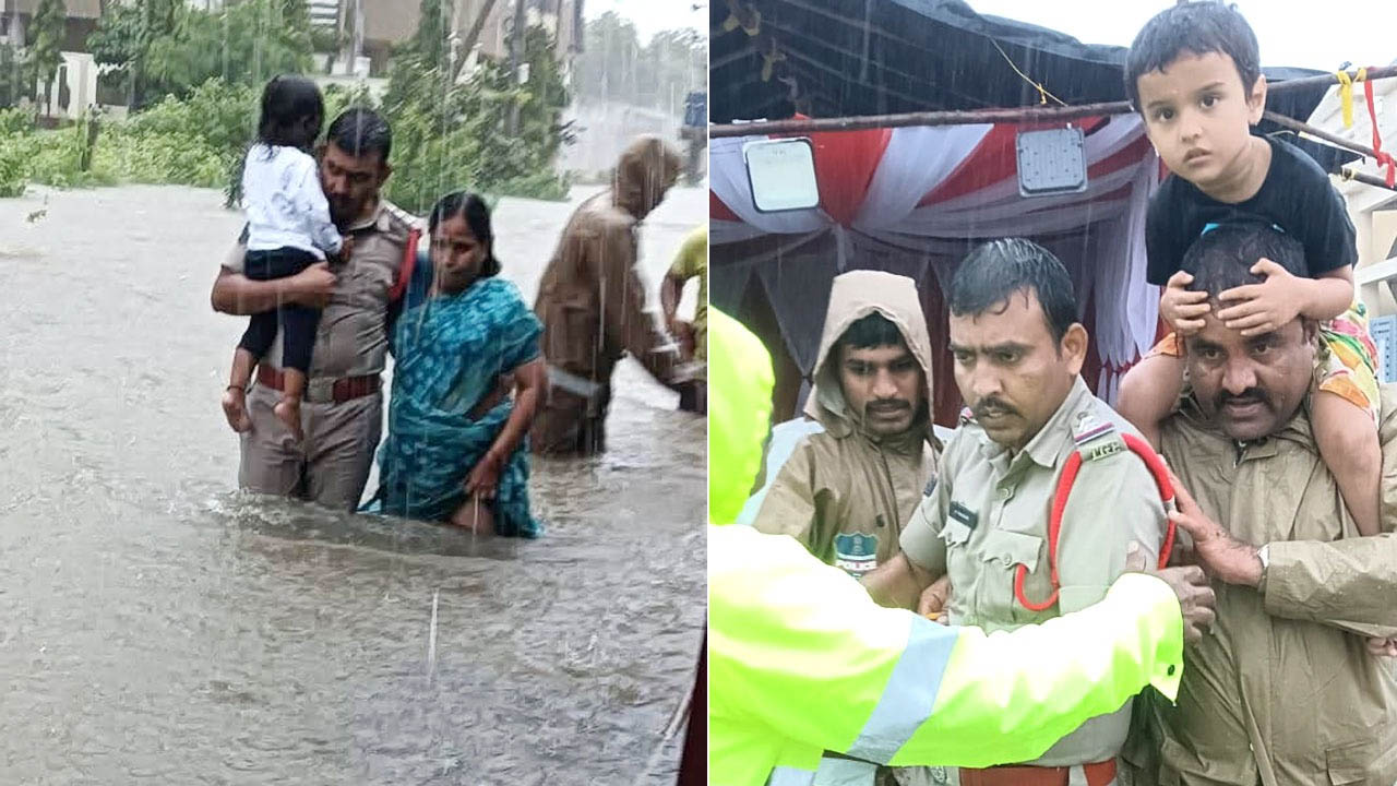 భారీ వరద(Heavy Floods)లతో ప్రజలు అందరు ఇళ్లలోనే ఉండిపోయారు. అధికారులు మాత్రం వర్షంలో సైతం ప్రజలకు అండగా నిలిచారు. ముఖ్యంగా పోలీసులు ఇళ్లను వదిలి వరద ముంపు ప్రాంతాల్లో సేవలు అందించారు. ఓ వైపు వర్షాలతో తమ కుటుంబ సభ్యులు ఎలా ఉన్నారోనని ఆందోళన చెందుతూనే.. వరదల్లో చిక్కుకున్న వారిని రక్షించారు.